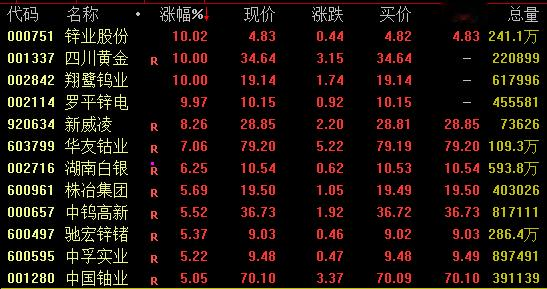 有色板块盘中强势上扬,钴、镍、黄金概念等集体活跃。截至收盘,锌业股份、四川黄金、翔鹭钨业、罗平锌电等涨停,华友钴业涨逾7%,湖南白银涨超6%。