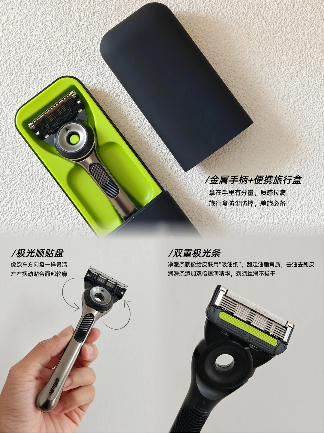 这把颜值真的高,全金属手柄质感无敌!它自带“去油条”(净澈条),刮胡子顺便带走角质和油腻感,刮完下巴非常清爽,大油田兄弟首选。还自带极光顺贴盘,像跑车方向盘一样灵活贴合脸型,搭配五层纳米级刀片,硬胡茬也能轻松剃掉。而且还自带旅行盒,差旅党兄弟直接揣兜里就能出发!