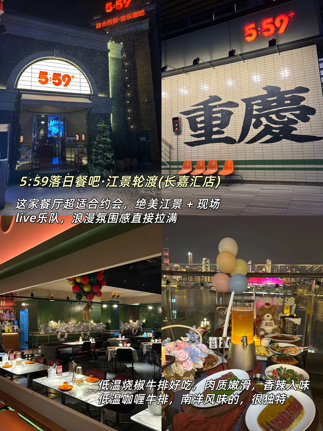💜5:59落日餐吧·江景轮渡(长嘉汇店):来重庆一定要去吃的重庆西餐,夜晚可以欣赏到绝美夜景!低温烧椒牛排和低温咖喱牛排很好吃,肉质软嫩无筋