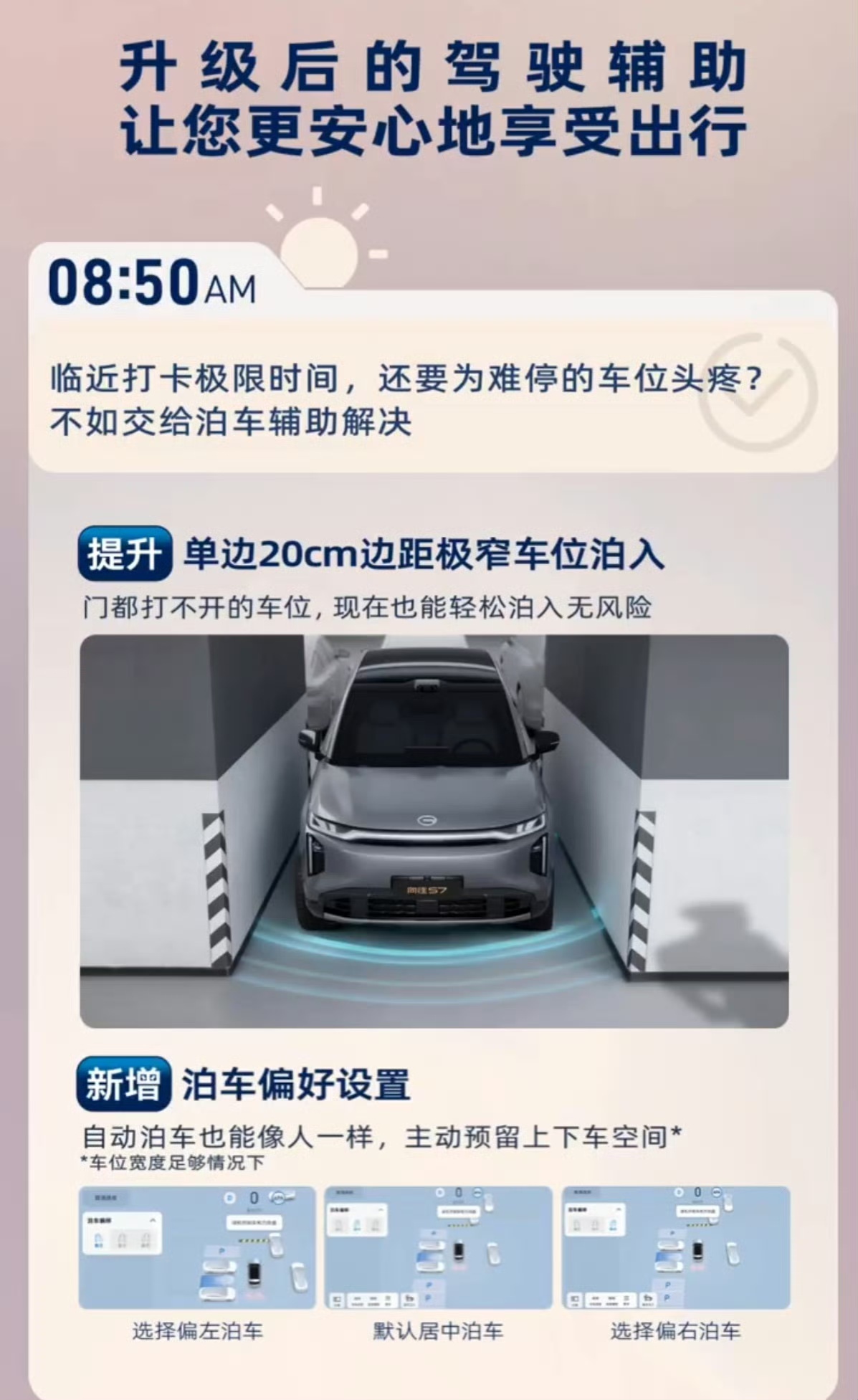 向往S7新年OTA再升级这波升级直接给向往S7装了个“AI老司机”!高速开到120km/h,遇到突发情况能自动刹停保安全;市区里怕鬼探头、低速防误踩油门,这些问题全给你搞定。40cm的极限窄车位也能一把停进去,还能选停中间、偏左或偏右,再也不用为抢车位头疼。另外,哨兵模式盯着爱车防剐蹭,五视角记录仪360°留证不怕碰瓷;手机能遥控后排屏幕,微信发个定位直接传到车机,过ETC都不用手动操作,通勤出门是真的省心!