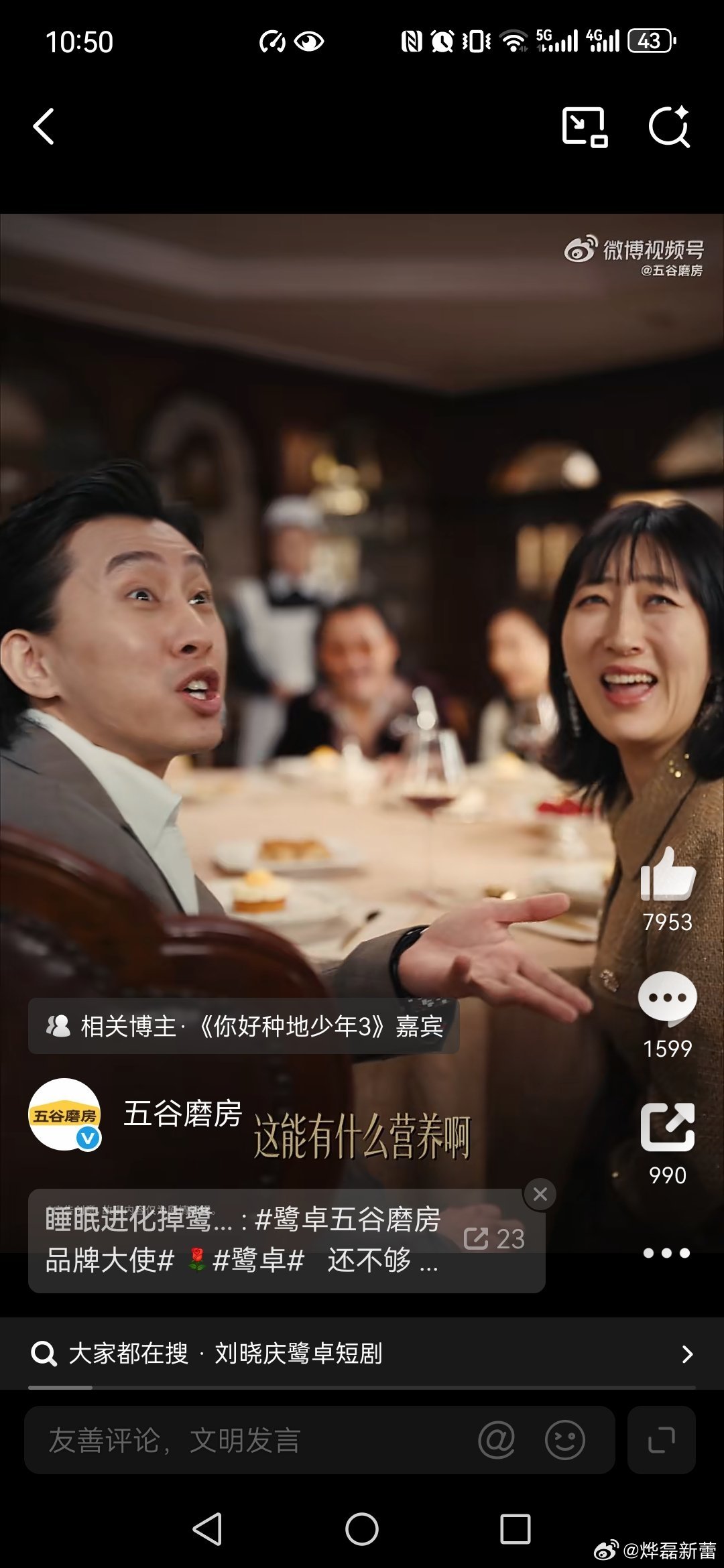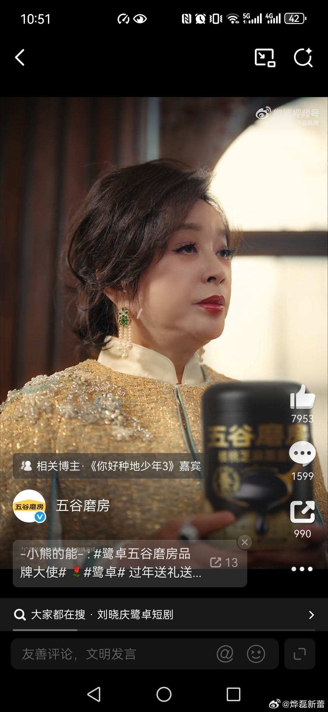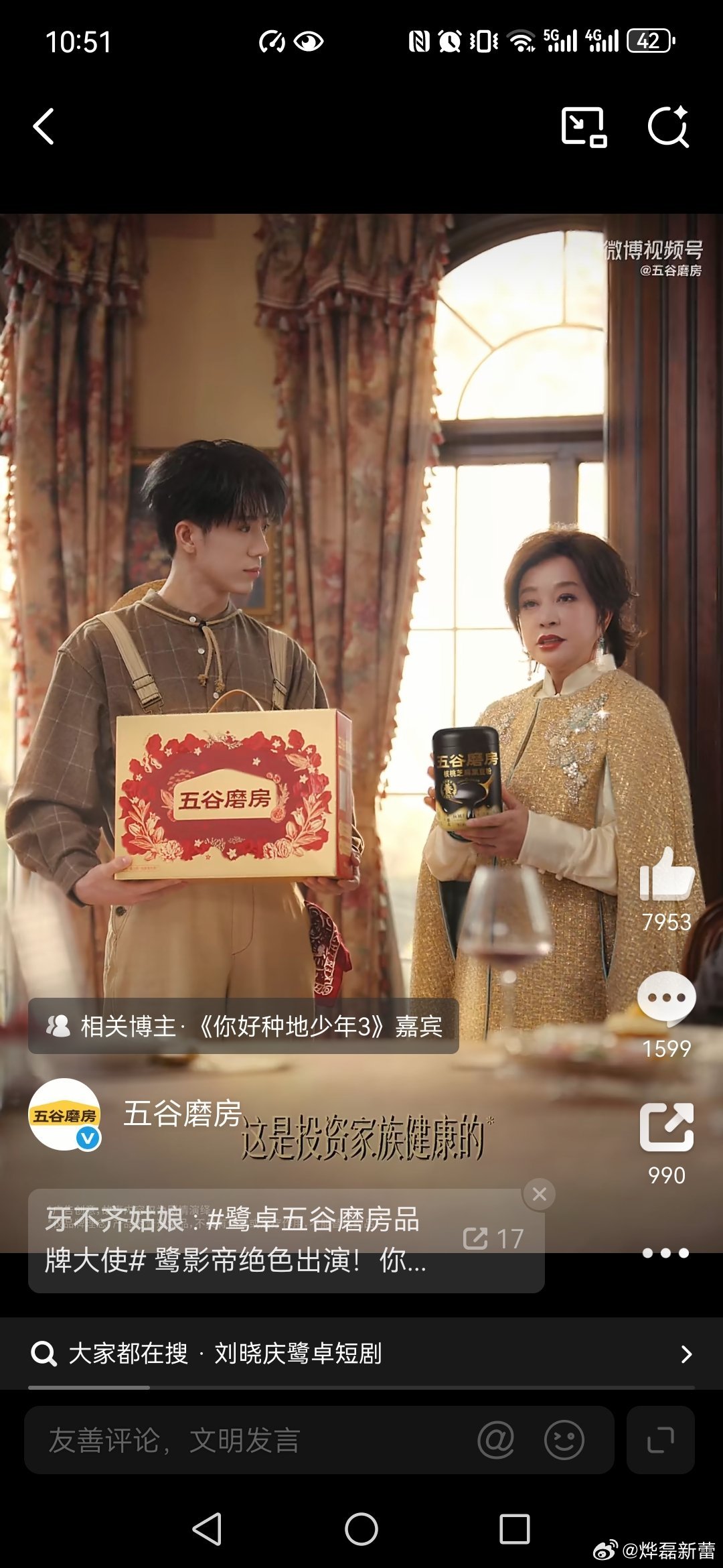 五谷磨房刘晓庆鹭卓上演五谷磨房豪门商战 观看了视频,恭喜鹭卓成为五谷磨房品牌大使,刘晓庆也推荐五谷磨房,因此我呼吁大家春节走亲访友就送五谷磨房,营养价值高,高钙高纤高蛋白,配料干净低GI,无添加、非转基因原料,因此送长辈送五谷磨房就是把健康送给了大家,也祝大家新的一年吃出健康、吃出福气,马年吉祥,一切平安。