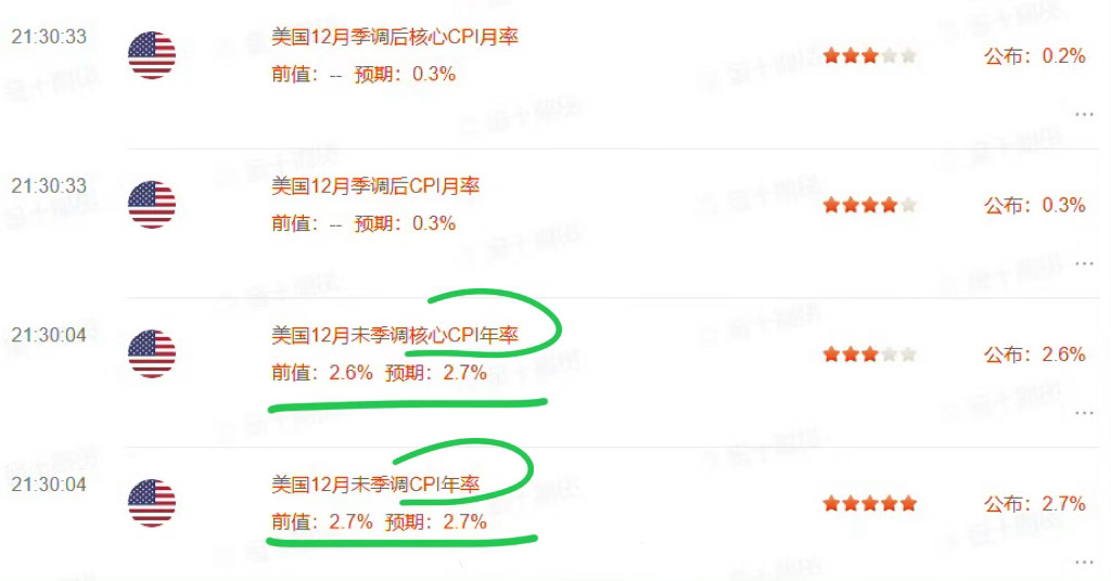美国12月CPI同比增长2.7%,预期2.7%,前值2.7%。环比增长0.3%,预期0.3%。美国12月核心CPI同比增长2.6%,预期2.7%,前值2.6%。环比增长0.2%,预期0.3%。美国CPI低于预期,白银黄金继续刷新历史新高!