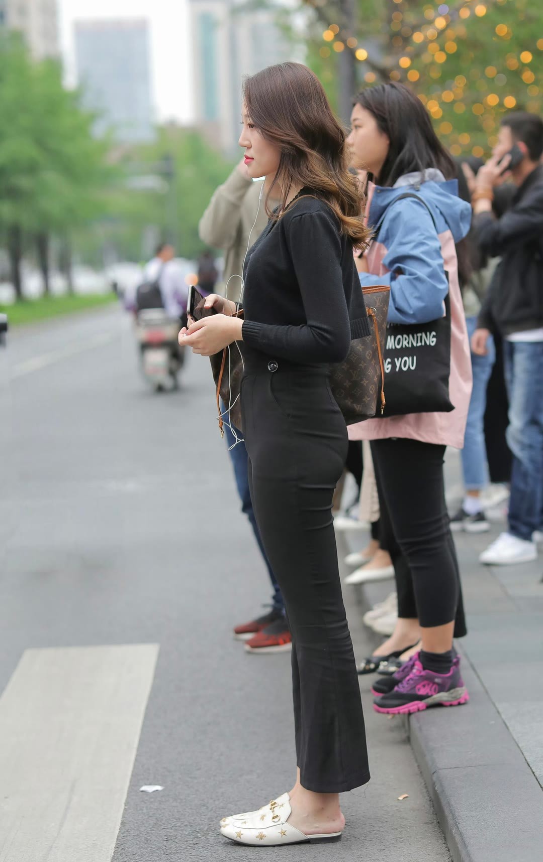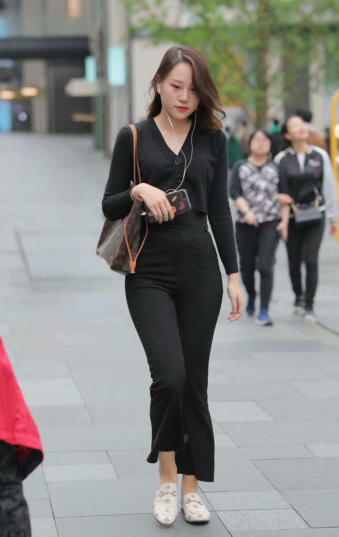 时尚穿搭黑色V领短款针织开衫,细腻针织肌理温柔又显瘦,短款剪裁露出腰线更显比例。搭配高腰黑色喇叭裤,细节处尽显都市女性的精致与干练。街拍美女穿搭每日穿搭