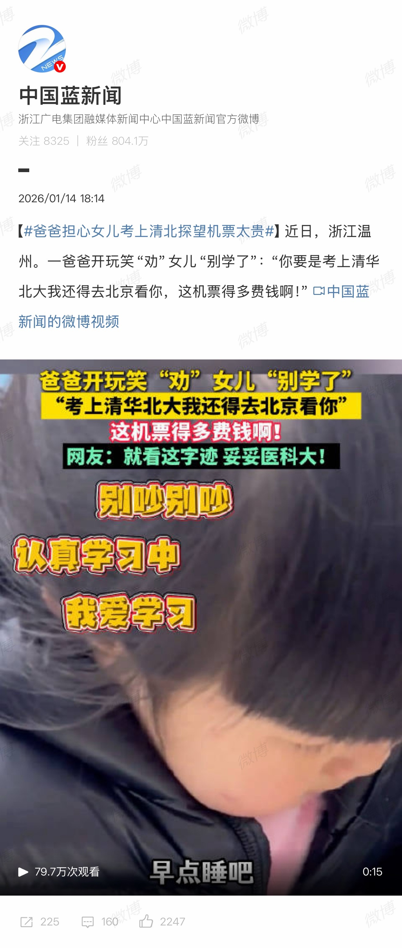 爸爸担心女儿考上清北探望机票太贵确定不是拍段子吗?本博觉得可信度太低了,大概率是