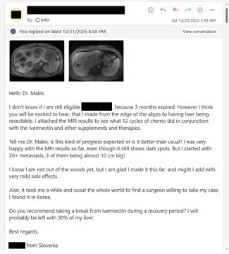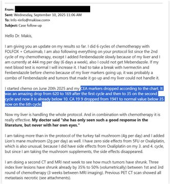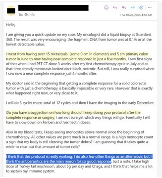 突发新闻:伊维菌素和芬苯达唑治疗案例——一位34岁的斯洛文尼亚男子,患有四期结肠癌,6个月后分享最新情况!肿瘤科医生震惊——几乎完全缓解,而他的肝脏里却满是癌细胞!这起案件必将载入史册! 😃你知道那种亲眼见证历史的感觉吗?这就是其中一种情况。 😉故事:一名34岁的斯洛文尼亚男子,患有四期结肠癌,肝脏也充满癌细胞。他于2025年6月开始伊维菌素 1mg/kg/天芬苯达唑起始剂量为444毫克/天,逐渐增加至1000毫克/天。化疗(FOLFOX,西妥昔单抗)6 个月后的结果:几乎完全有效!“我想你会很高兴听到,我从生死边缘走了出来,现在肝脏可以切除了。我附上了核磁共振成像图,看看12个疗程的化疗,配合伊维菌素和其他补充剂和疗法,效果如何。”“我最初发现有 20 多个转移灶,其中 3 个直径接近 10 厘米!”要点:我的医生说:“她只在文献中见过如此好的疗效,但从未亲眼见过。”“我的医生一开始就说,仅靠化疗几乎不可能或非常罕见地使实体结直肠肿瘤完全缓解。然而,现在的情况恰恰如此,或者说非常接近完全缓解。”“我服用的云芝剂量超过了推荐剂量(每天 4 克),我还额外服用了猴头菇(每天 2 克)。我对 5-氟尿嘧啶和奥沙利铂都没有任何副作用,这很不寻常,因为我在第三个和第四个疗程中使用奥沙利铂时都出现了副作用,但自从我开始服用蘑菇补充剂后,这些副作用就消失了。“我每天服用大剂量的云芝(约 5 克)和白桦茸,我认为这对我维持免疫系统有很大的帮助。”肝脏充满癌细胞时,还能服用伊维菌素和芬苯达唑吗?答案显而易见,是的!!这是一个具有历史意义的案件。BREAKING NEWS: IVERMECTIN and FENBENDAZOLE Testimonial - 34 year old SLOVENIA man with Stage 4 Colon Cancer gives update after 6 months!! Oncologist shocked - near complete response, from a liver FULL of Cancer!This is a case that will be in HISTORY BOOKS! 😃You know that feeling when you are witnessing history? This is one of those situations. 😉STORY: 34 year old SLOVENIA man with Stage 4 Colon Cancer and liver FULL of cancerIn June 2025 he startedIvermectin 1mg/kg/dayFenbendazole 444mg/day increasing to 1000mg/dayChemo (FOLFOX, Cetuximab)Results after 6 months: Almost complete response!"I think you will be excited to hear, that I made from the edge of the abyss to having liver being resectable. I attach MRI to see what 12 cycles of chemo did in conjunction with the Ivermectin and other supplements and therapies""I started with 20+ metastases, 3 of them being almost 10cm big!"KEY POINTS:“My doctor said "she has only seen such a good response in the literature, but never with her own eyes." "“My doctor said in the beginning that getting a complete response for a solid colorectal tumor with just a chemotherapy is basically impossible or very rare. However that is exactly what happened right now, or very close to it.”“I am taking more than in the protocol of the turkey tail mushroom (4g per day) and I added Lion's mane mushroom (2g per day) as well. I have zero side effects from 5FU or Oxaliplatin, which is also unusual, because I did have side effects from Oxaliplatin on my 3. and 4. cycle, but since I am taking the mushroom supplements, the side effects disappeared.”“I take high dose of Turkey tail mushroom, about 5g per day and Chaga, and I think that helps me a lot to sustain my immune system.”Can you take Ivermectin and Fenbendazole when the liver is FULL of cancer? You can see clearly, the answer is YES!!This is a history-making case.