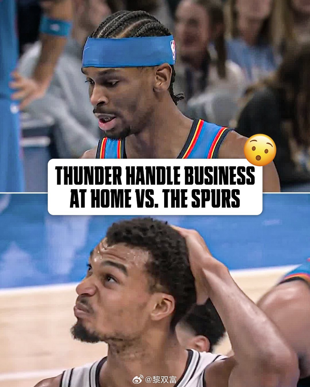 雷霆在0-3后终于在主场赢了马刺一场,SGA赛后场地采访时说,这场并不值得像赢超级碗那样去庆祝,就是82场常规赛中的一场;文班亚马说,他整场就听到客场球迷一次骂Fuck you。