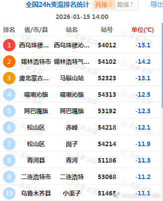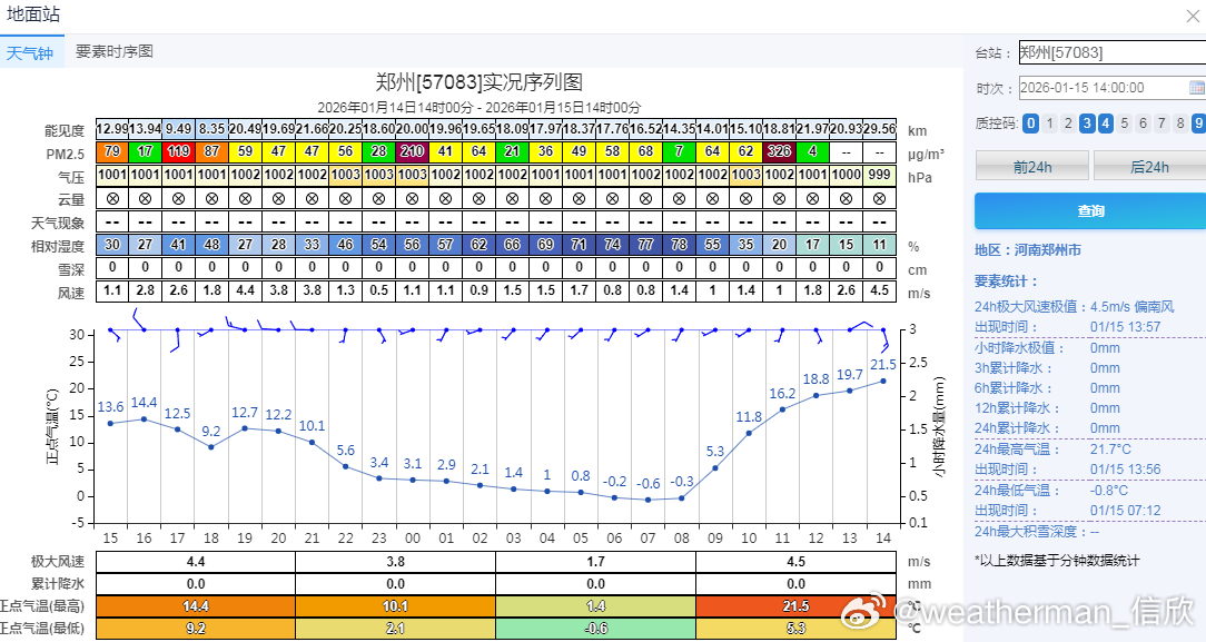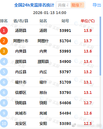 【气温——郑州破纪录】今天白天我国气温走势不同。辽宁东部、河北南部、河南、山东、贵州、新疆西南部等地气温大幅回升。河南汤阴升13.9℃、新疆阿图什升13.7℃、河北邢台升13.1℃,辽宁凤城升12.6℃,为各自省区14时升温最强站点。截至14时最高气温,郑州21.7℃,打破当地1月最高气温纪录。今天因为冷空气影响,新疆北部和东部、甘肃西部、内蒙古中部等地出现明显降温。内蒙古西乌珠穆沁旗降15.1℃、甘肃马鬃山降13.1℃、新疆青河降11.3℃,为各自省区14时降温最强站点。