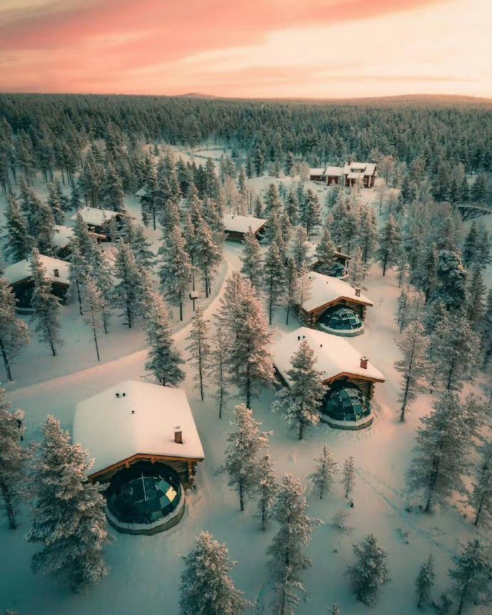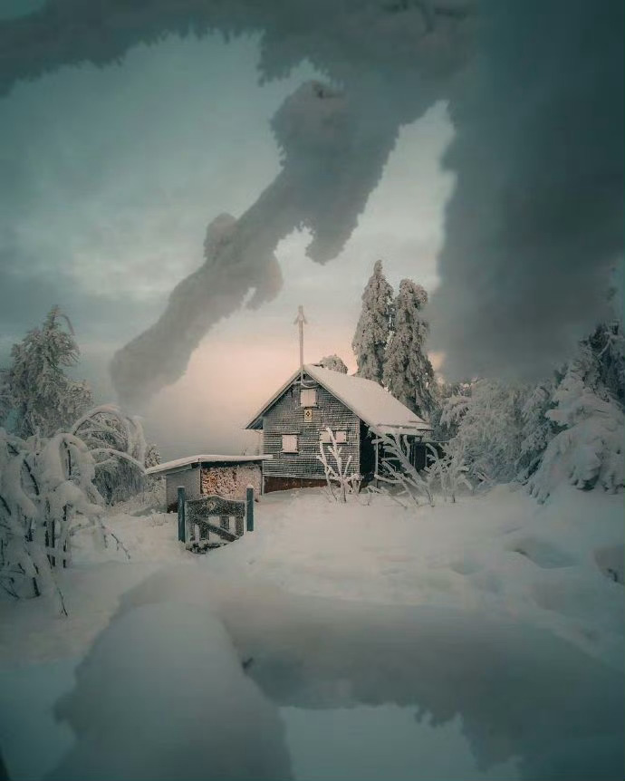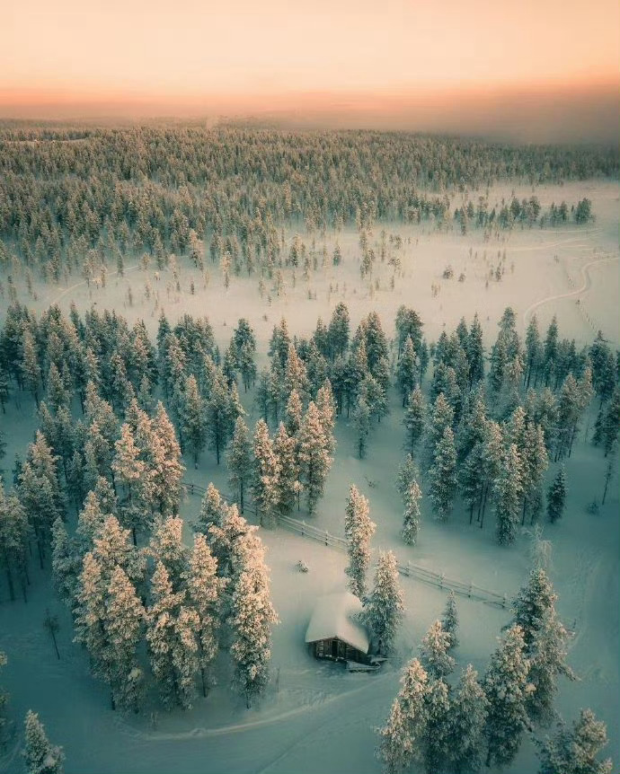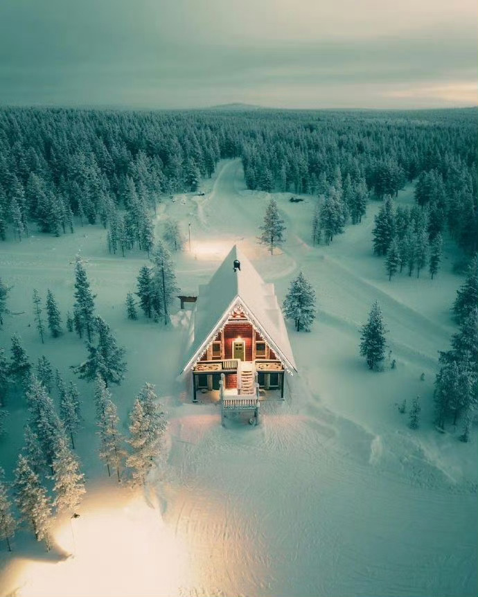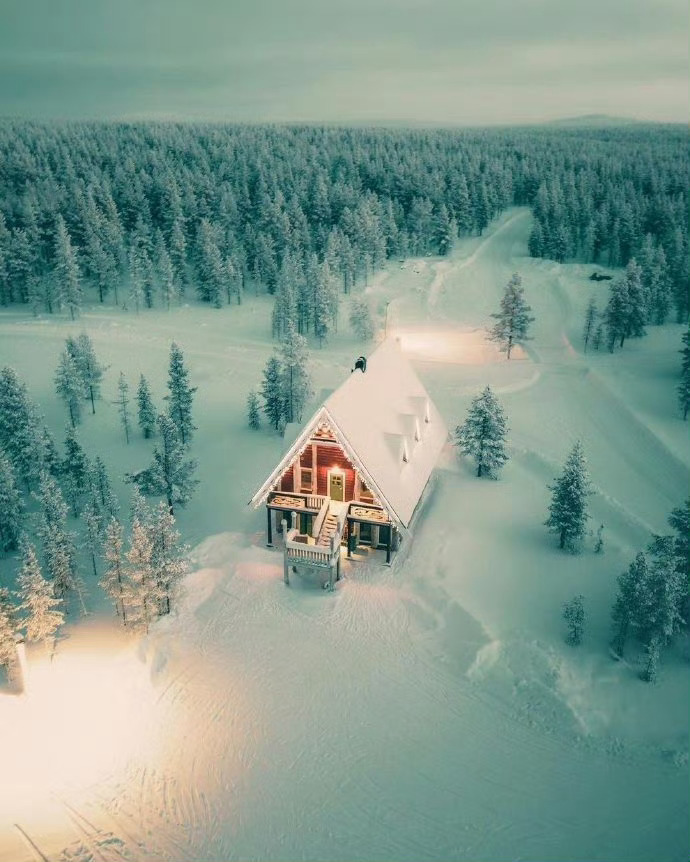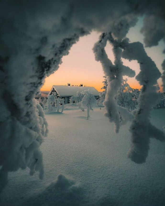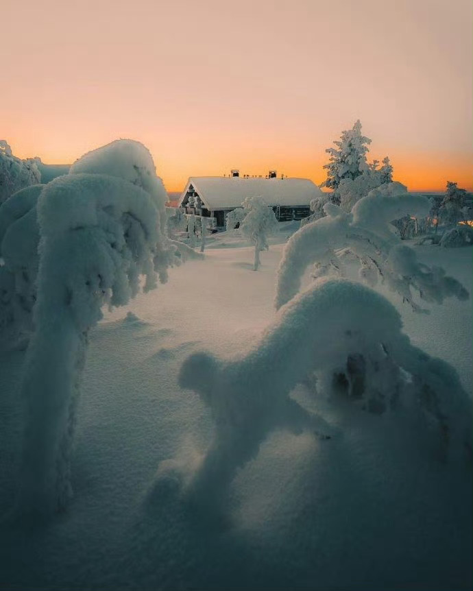 芬兰,世纪大雪里的森林小木屋。