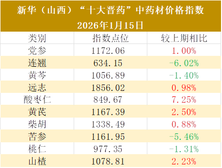 新华财经北京1月15日电(李夷骞)截至1月15日,新华(山西)“十大晋药”中药材价格指数报1129.28点,较上期(2025年12月30日,下同)上涨1.50点,涨幅0.13%,与基期相比,上涨129.28点,涨幅12.93%。元旦过后酸枣仁行情反弹上涨,山西“十大晋药”中药材价格指数六涨四跌。