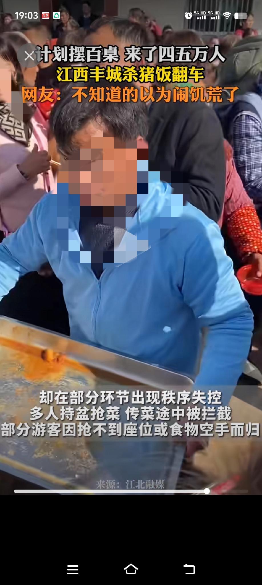 江西丰城这下出名了,请人吃杀猪饭,结果菜还没到桌就被抢光了! 看到了没?想复制人家呆呆可不是容易的事,想要成功需要天时地利人和,最关键的还是人! 话说就这个抢饭的阵势,当地人估计这辈子再也不敢说请客的话了。泼天的富贵就在眼前,可惜搞砸了,这让当地文旅局情何以堪?当地人何言以对。