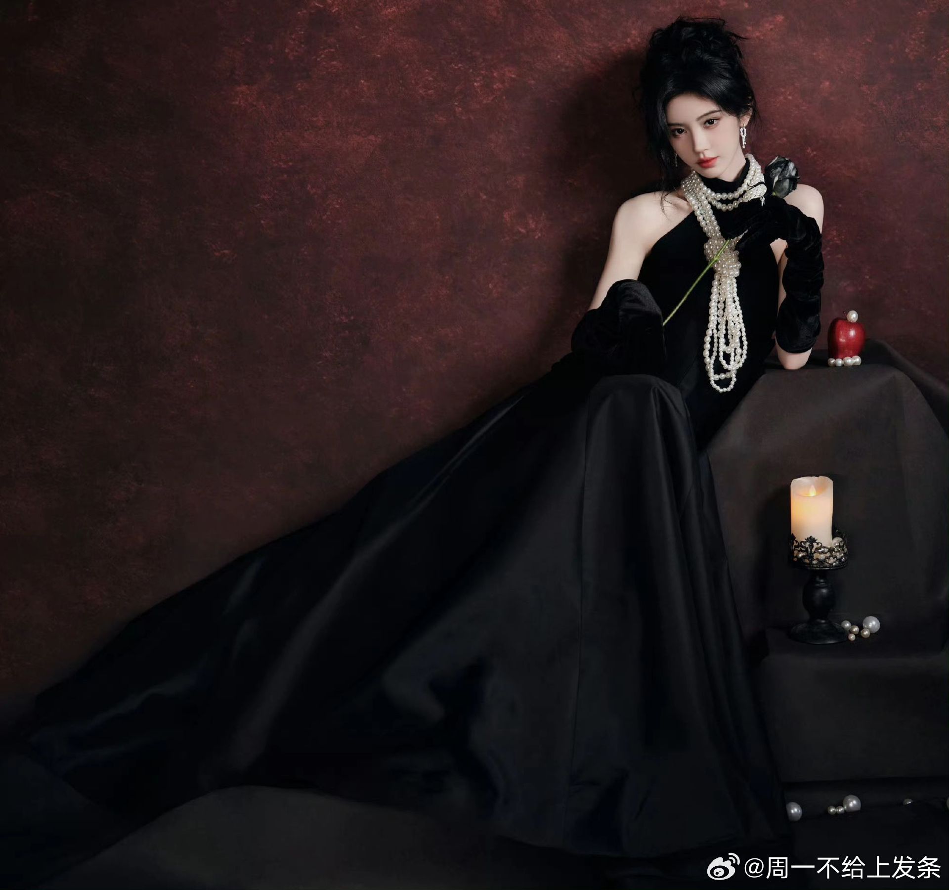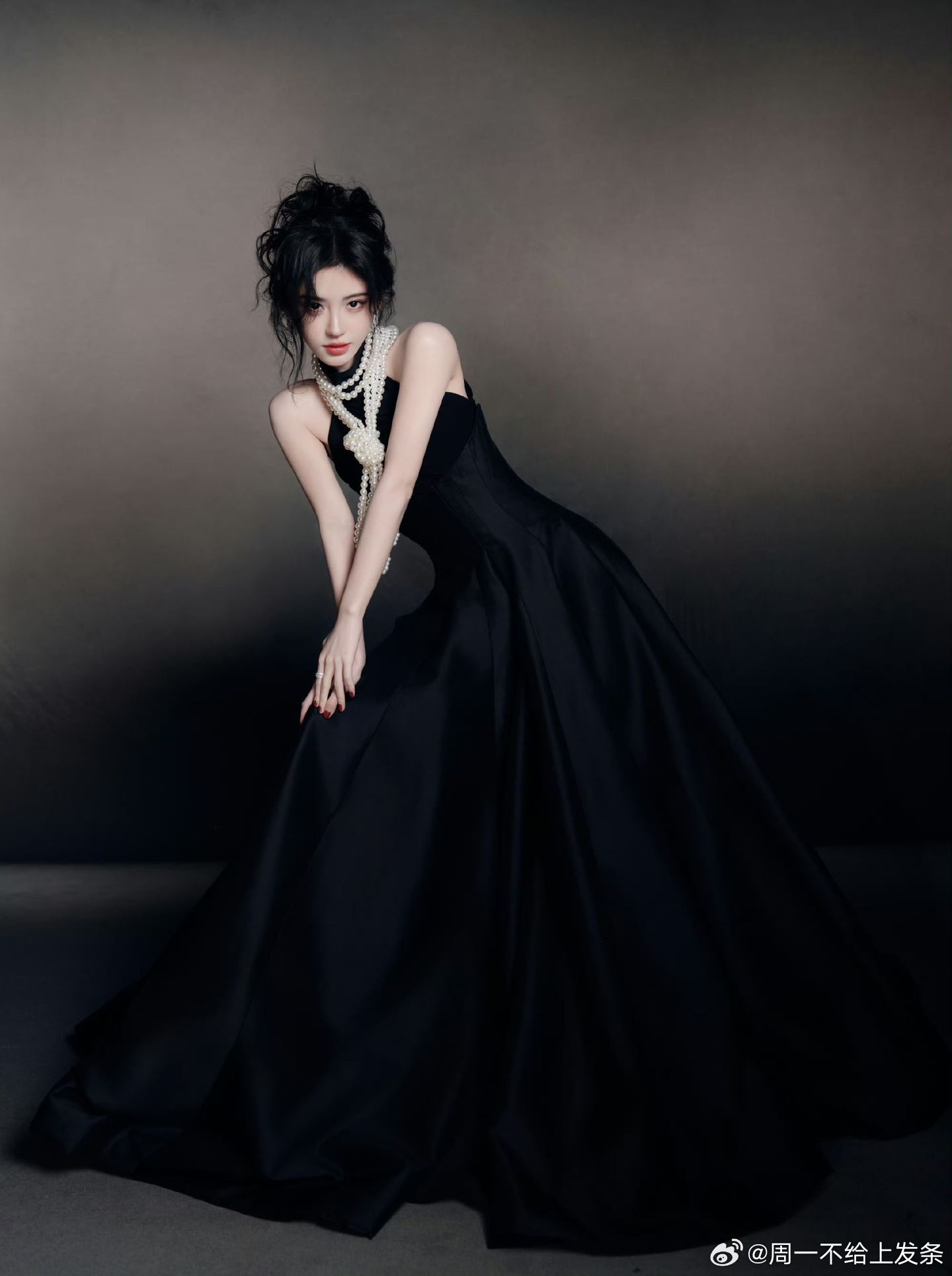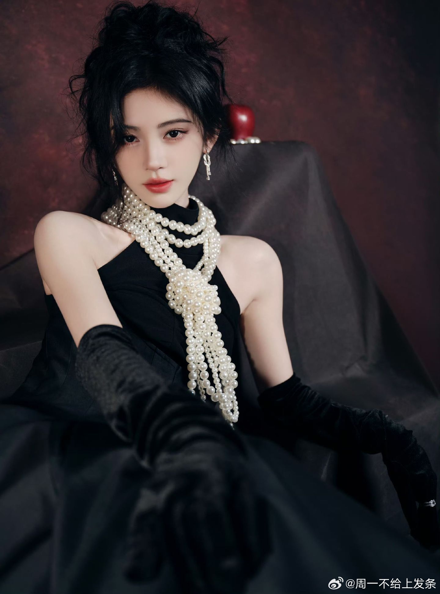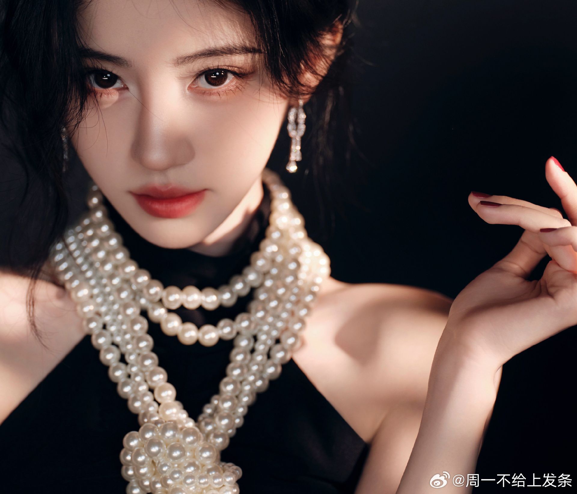 鞠婧祎 一袭黑色衣裙勾勒窈窕曲线,颈间珍珠项链如星子缀颈,温润柔光中和黑裙的冷艳。清冷眉眼缀着珠光,复古贵气与疏离感交织,精致得无可挑剔~