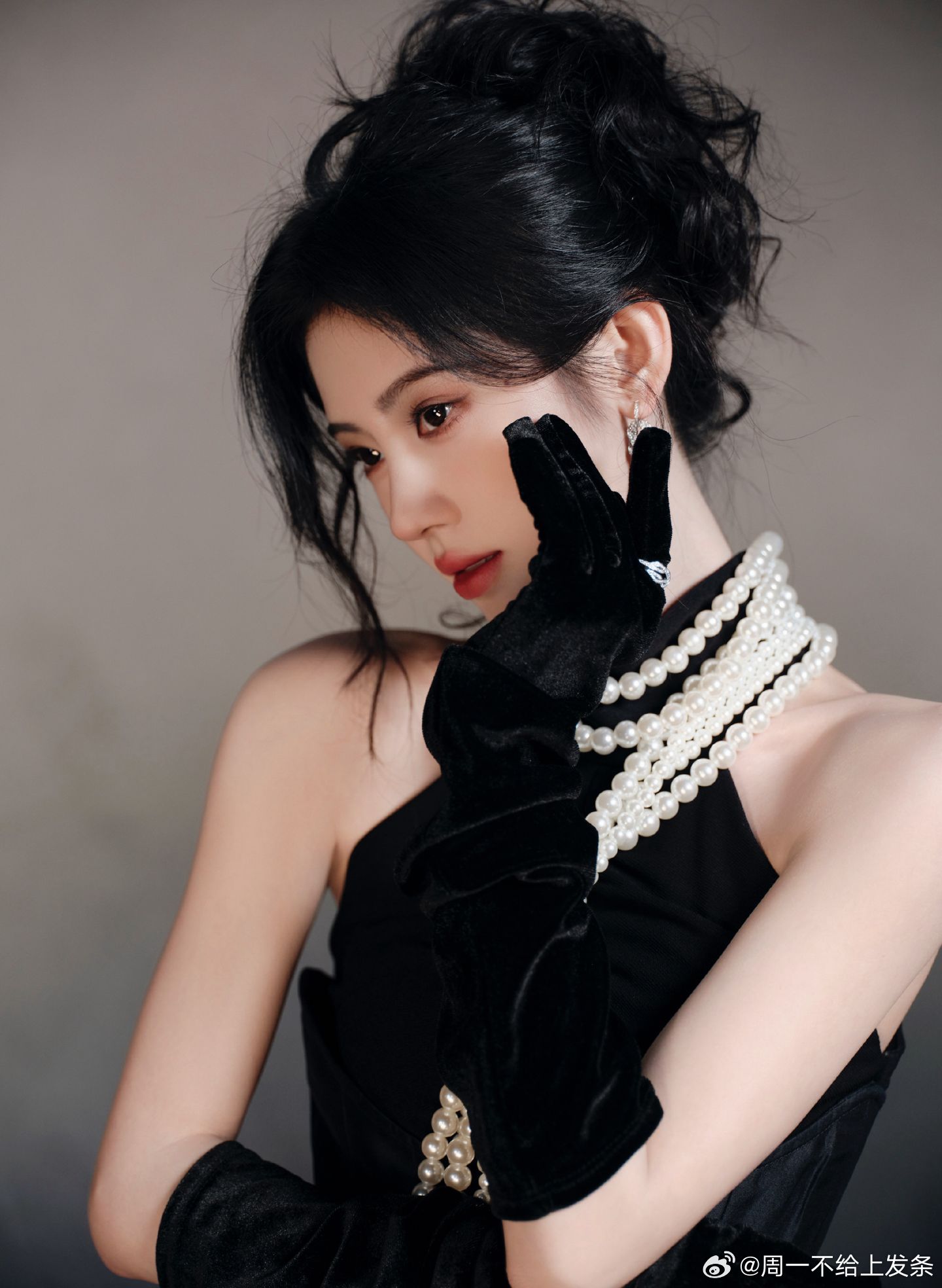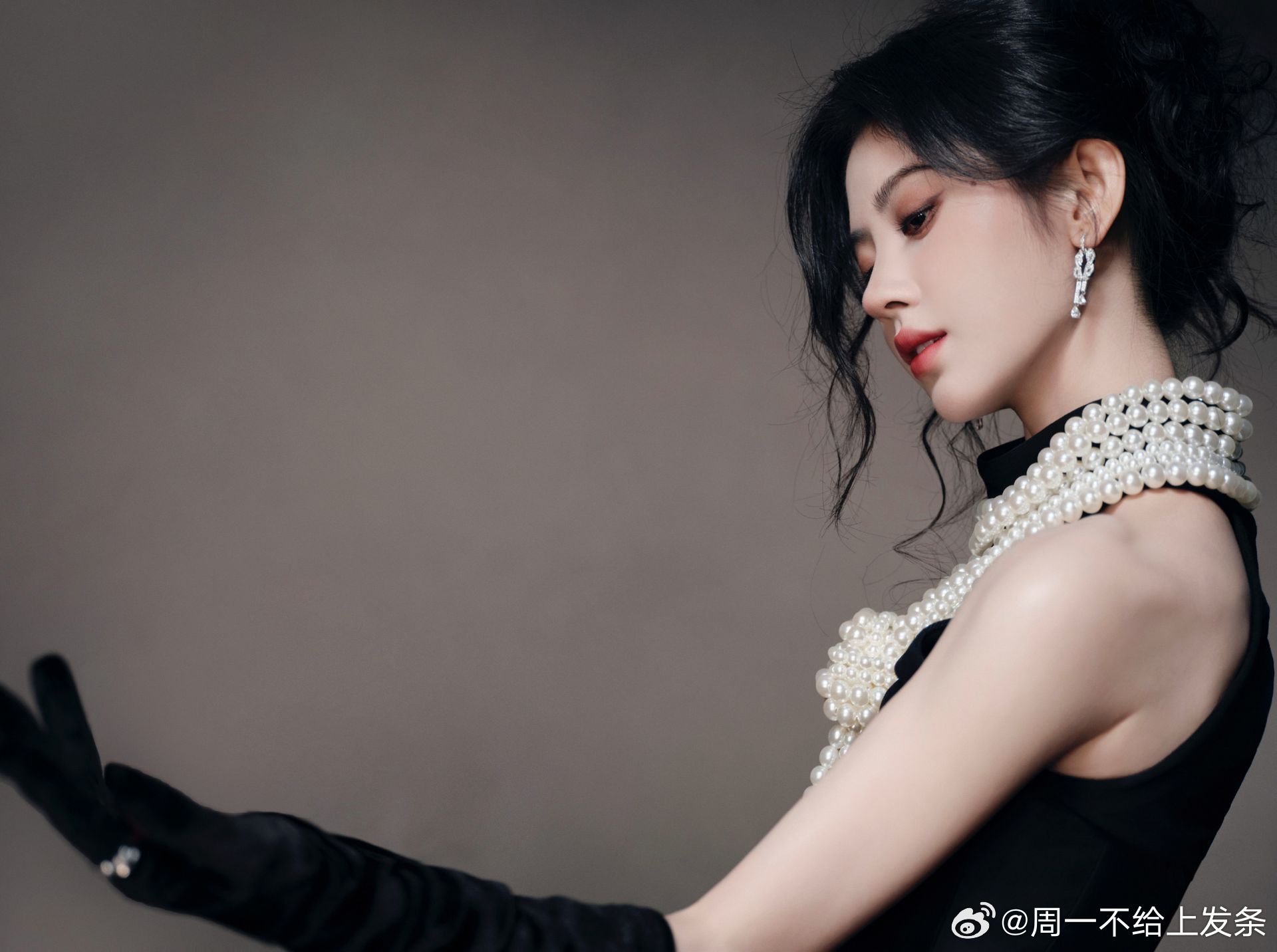 鞠婧祎 一袭黑色衣裙勾勒窈窕曲线,颈间珍珠项链如星子缀颈,温润柔光中和黑裙的冷艳