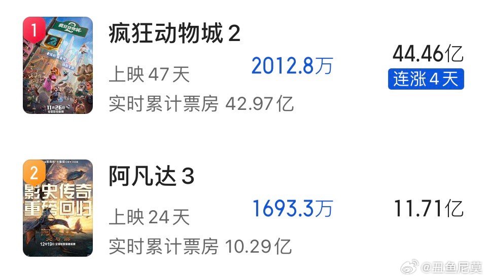 《疯狂动物城2》票房将在明天破43亿,最终45亿问题应该不大。关键是看能不能超过《唐探2》以及《满江红》。《动物城2》密钥再次延长,时间还是很充足的。《阿凡达3》破12亿应该不难。