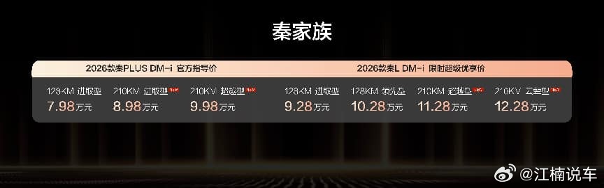 比亚迪秦家族长续航版武汉上市,起售价8.98万元2026年1月9日,比亚迪在武汉新荣天街举行发布会,正式推出2026款秦L DM-i及秦PLUS DM-i 210KM长续航版,售价区间为8.98万元至12.28万元。比亚迪比亚迪 新车核心亮点是纯电续航首次突破200公里大关,达到210公里,满油满电综合续航高达2110公里,百公里亏电油耗低至2.79升。其中,秦L DM-i高配车型搭载了云辇-C智能车身控制系统,提升了驾乘舒适性;两款车型均升级了智能座舱与辅助驾驶系统。比亚迪王朝网湘鄂赣战区运营经理在发布会上透露,秦家族已累计交付超过270万辆。2026款新车型旨在以“超长续航”和“越级配置”进一步巩固其在插电混动家轿市场的领先地位。此次上市的新车提供了多项限时购车权益,包括金融贴息、配置升级等,全系车型享受三电系统终身保修等服务。发布会上,比亚迪还为首批武汉车主举行了交付仪式,标志着新车正式进入市场。