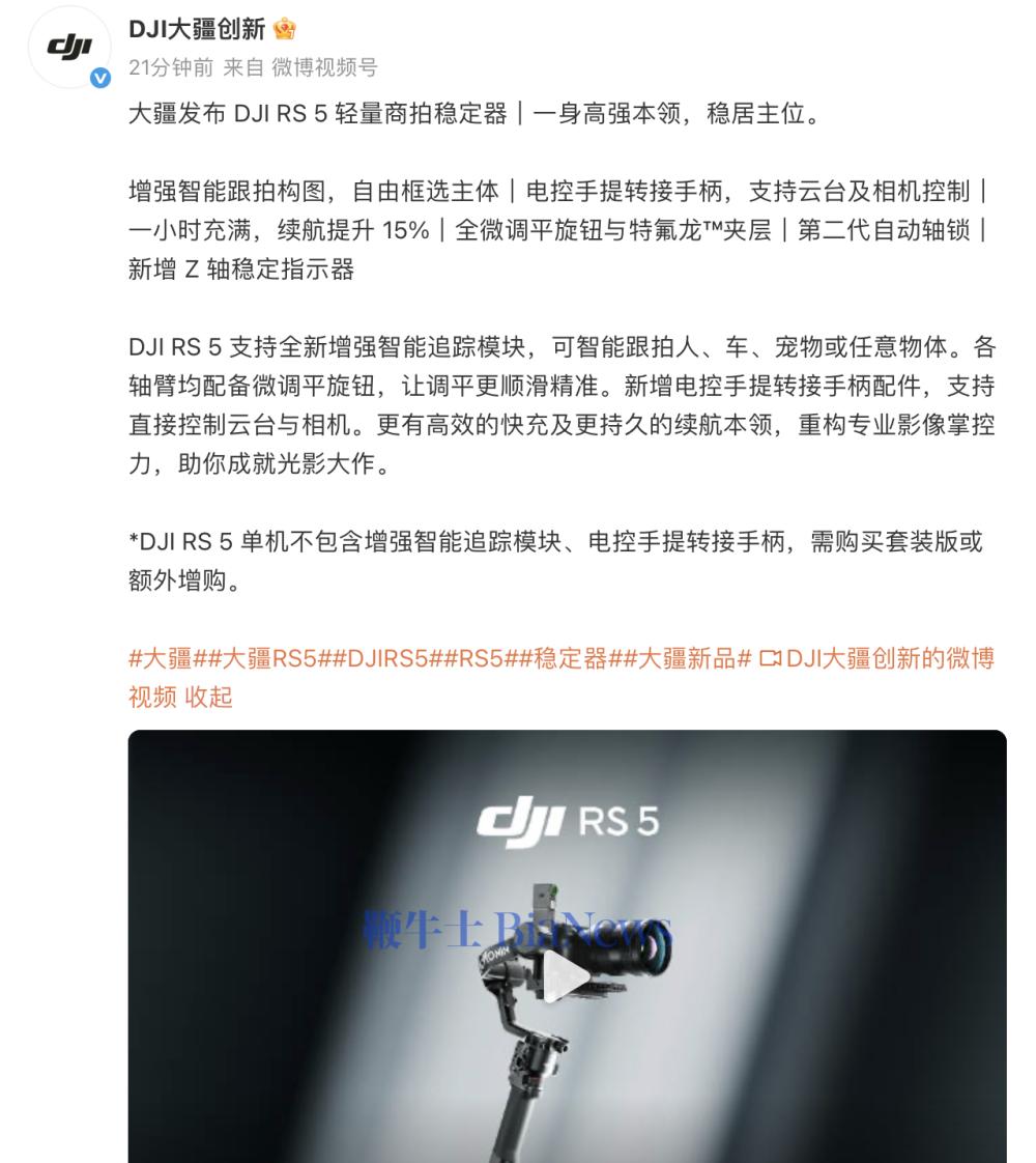 1月15日,大疆发布DJIRS5轻量商拍稳定器,标准版售价3099元,套装版售价3899元,即日起正式开启预约。
