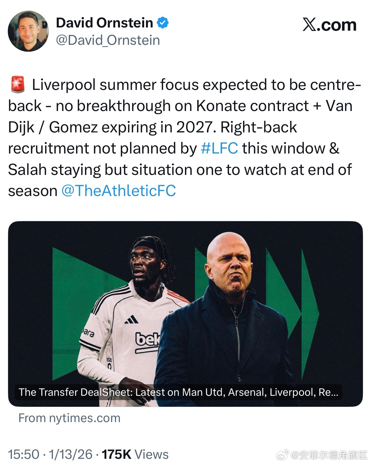 看了标题就不想看全文了 奥恩斯坦说我军今夏的转会重点就是中后卫,现在和科纳特的续约谈判没有任何紧张,戈麦斯和范迪克的合同都会在27年到期。右后卫的引援也不在我军今夏的计划之中,萨拉赫会在冬窗后留队但是到了赛季末还是要关注萨拉赫的情况。我军目前是无意在冬窗寻找莱奥尼或者是伊萨克的替代者的,布拉德利的情况也差不多如此。利物浦方面希望布莱德利可以在季前赛开始的时候回归,鉴于利物浦的运作方式他们也不会为了考虑短期的填补而永久签约一名球员。