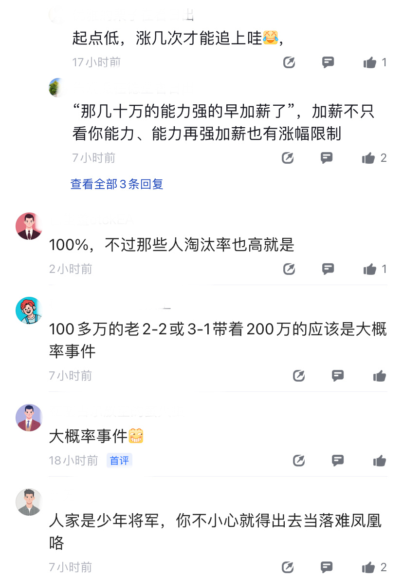 字节同学隐约感觉到,2026年公司可能会出现一些年薪不到一百万的老员工,带着几个年薪200万的筋斗云和100万的校招生干活评论区不少字节同事表示,100多万的老2-2或3-1带着200万的干活,应该是大概率事件。其实,近几年互联网企业发展迅速,薪资倒挂的事屡见不鲜,但没想到现在通胀已经这么离谱了问题是能进字节的,当年谁还不是天之骄子呢?在加薪有涨幅限制的情况下,有能力的老员工得调薪多少次,才能赶上新人啊?