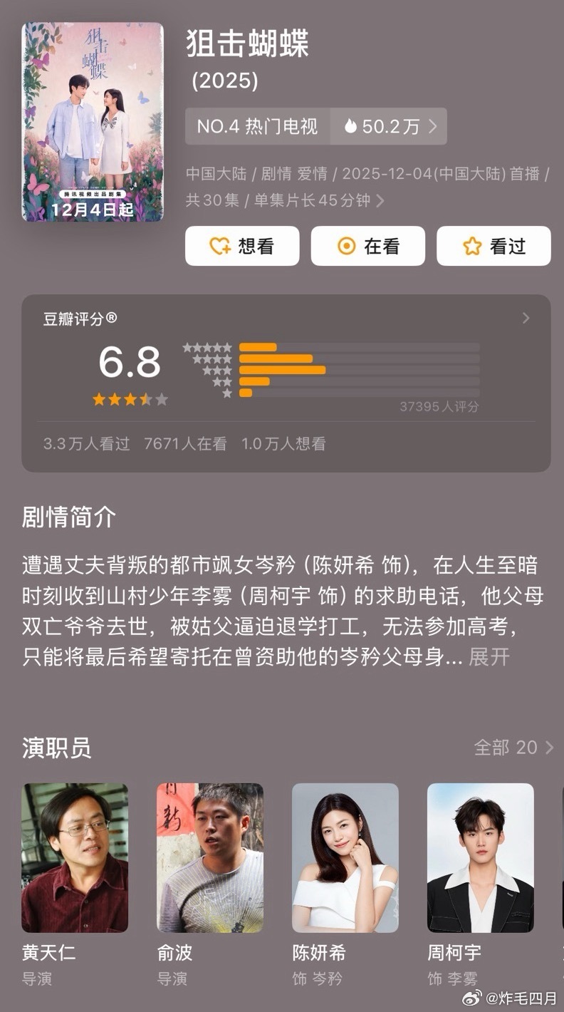 黄天仁导演以后的代表作除了《想见你》,可以写上陈妍希和周柯宇的《狙击蝴蝶》,不用写上那部不如预期的《在暴雪时分》了。接下来马上安排新的偶像剧,华策的《你那儿几点》,男主王安宇,女主章若楠。 你那儿几点 王安宇