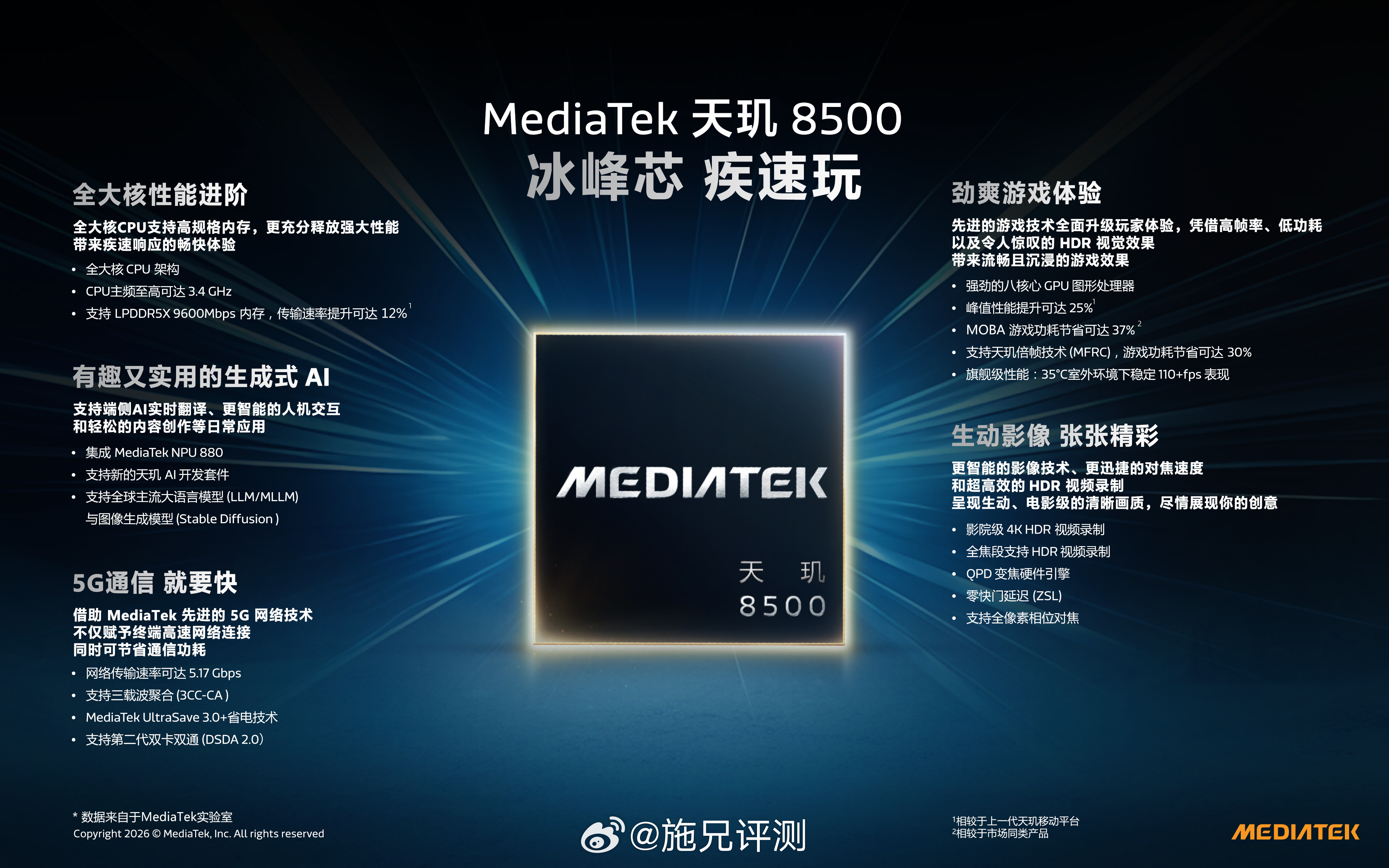 联发科发布两颗芯片:天玑9500s和天玑8500天玑8500产品信息天玑 8500 采用高能效4nm 制程,全大核架构CPU 包含 8 个主频至高可达3.4GHz 的 Cortex-A725 大核,带来性能和能效的进一步提升。天玑 8500 支持精准的调度技术,支持传输速率更高的 LPDDR5X 9600Mbps 内存,用户在日常应用、游戏和多任务处理等使用场景中能够享受丝滑流畅、持久续航。天玑 8500 搭载性能更强的八核 Mali-G720 GPU,峰值性能相较上一代提升25%,功耗相较上一代峰值性能下降低20%。得益于全面升规的计算核心、天玑调度和星速双引擎,天玑 8500 可为玩家带来兼具游戏满帧稳帧、疾速加载和冰峰高能效的劲爽体验。此外,天玑 8500 还将光线追踪技术落地于主流移动游戏,提供更加逼真的画质效果,显著提升玩家的沉浸感。MediaTek天玑 8500的特性还包括:1、集成性能强劲的MediaTek NPU 880,支持全球主流大语言模型(LLM/MLLM)和图像生成模型(Stable Diffusion)2、支持 AI 超清晰长焦算法,细节高度还原,远近皆清晰3、天玑 AI 语义分割引擎,可智能识别视频内容帧帧调优4、支持AI 反光、炫光、魔法消除技术,一键直出高品质照片天玑 9500s采用旗舰3nm制程和全大核架构,八核CPU包含 1 个主频高达3.73GHz 的 Cortex-X925 超大核,以及 3 个 Cortex-X4 超大核和 4 个 Cortex-A720 大核,配备同档出众的旗舰大容量高速缓存,结合旗舰级天玑调度引擎,赋能终端充分发挥强大性能和能效表现。天玑 9500s 搭载Immortalis-G925 GPU ,提供重载硬核手游满帧、沉浸式的畅游体验,满足游戏发烧友、电竞选手对性能的期待。天玑 9500s支持先进的光线追踪技术,天玑 OMM 追光引擎能够高效渲染图形,大幅提升游戏画面的真实感和精细度,带来主机级的环境光照和反射效果。此外,借助天玑星速引擎的自适应技术 3.0(MAGT 3.0)和天玑倍帧技术 3.0(MFRC 3.0),天玑 9500s可显著提高主流游戏的能效表现,延长终端的续航时间。该芯片还支持165超高帧游戏,助力玩家体验快人一步。天玑 9500s 集成旗舰级NPU,拥有卓越的端侧 AI 性能,面向生成式推理、多模态模型进行了优化,以构建强大的旗舰端侧影像、内容生成等多元能力。该芯片支持端侧 AI 实况照片美化、AI 照片编辑(扩图、抠图、消除),AI 内容摘要(通话、会议和文件)等日常高频功能,助力终端厂商打造用户的个人随身 AI 设备,满足日益增长的社交、生产力场景需求。天玑 9500s搭载先进的MediaTek Imagiq影像处理器,支持实时 30 帧运动追焦和 8K 全焦段杜比视界 HDR视频录制,视频创作者可轻松捕捉清晰、生动的视频画面。此外,该芯片还支持杰出的抓拍和降噪技术,带来既快又清晰的旗舰拍照体验。MediaTek天玑 9500s的特性还包括:1、5G Release-17 调制解调器,支持四载波聚合技术(4CC-CA) ,网络下行传输速率可达7Gbps 2、支持MediaTek 5G UltraSave 4.0 省电技术3、支持AI 网络套件 2.0,可提升弱网环境下的网络性能4、支持MediaTek Xtra Range ™ 3.0 技术,延伸室内 Wi-Fi的连接距离5、手机对手机蓝牙直连可达 5 公里