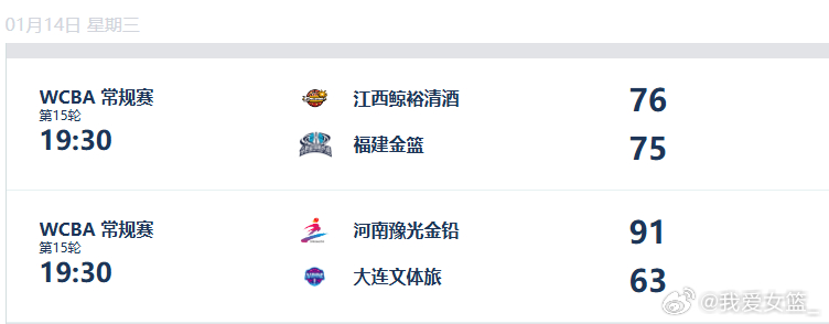 【WCBA今日综述:江西女篮取赛季首胜,江苏主场不敌新疆队】2025-2026赛季WCBA常规赛今日精彩继续,今天有5场比赛,其中江西女篮凭借着杨珂菁的准绝杀,主场1分险胜福建女篮,豪取赛季首胜。而缺兵少将的江苏女篮主场不敌新疆女篮,河北女篮和山西女篮均捍卫了各自主场。探营wcba球队 【A组】 山西竹叶青酒 91-78 上海浦发银行,山西双塔称霸篮下,埃格博狂砍28分17篮板,布朗26分9篮板,惠特尔14分。上海女篮卡特空砍36分7篮板,露西24分16篮板。 新疆天山 70-63 江苏南钢,武桐桐独得21分7助攻,王雪朦18分,莫普雷米尔16分13篮板。江苏女篮4名大将缺席无奈输球,洪欣妍15分6篮板,许晨妍10分。 石家庄英励 89-79 陕西天泽,戴维斯大爆发砍下51分11篮板,彭晓彤15分,王丽丽12分9篮板。陕西女篮卡尔霍恩空砍22分10篮板,库克斯19分12篮板,周梦云12分。 【B组】 江西鲸裕清酒 76-75 福建金篮,杨珂菁最后时刻上演三分准绝杀,全场得到13分5助攻,许艳雪25分9篮板,张瀞丹16分。福建女篮功亏一篑,埃吉奥福28分13篮板,谭如梦23分。 河南豫光金铅 91-63 大连文体旅,斯塔福德20分14篮板,沃克贡献18分7助攻,孙梦昕17分,施泰因贝加11分10篮板。辽宁女篮库珀空砍26分7助攻。