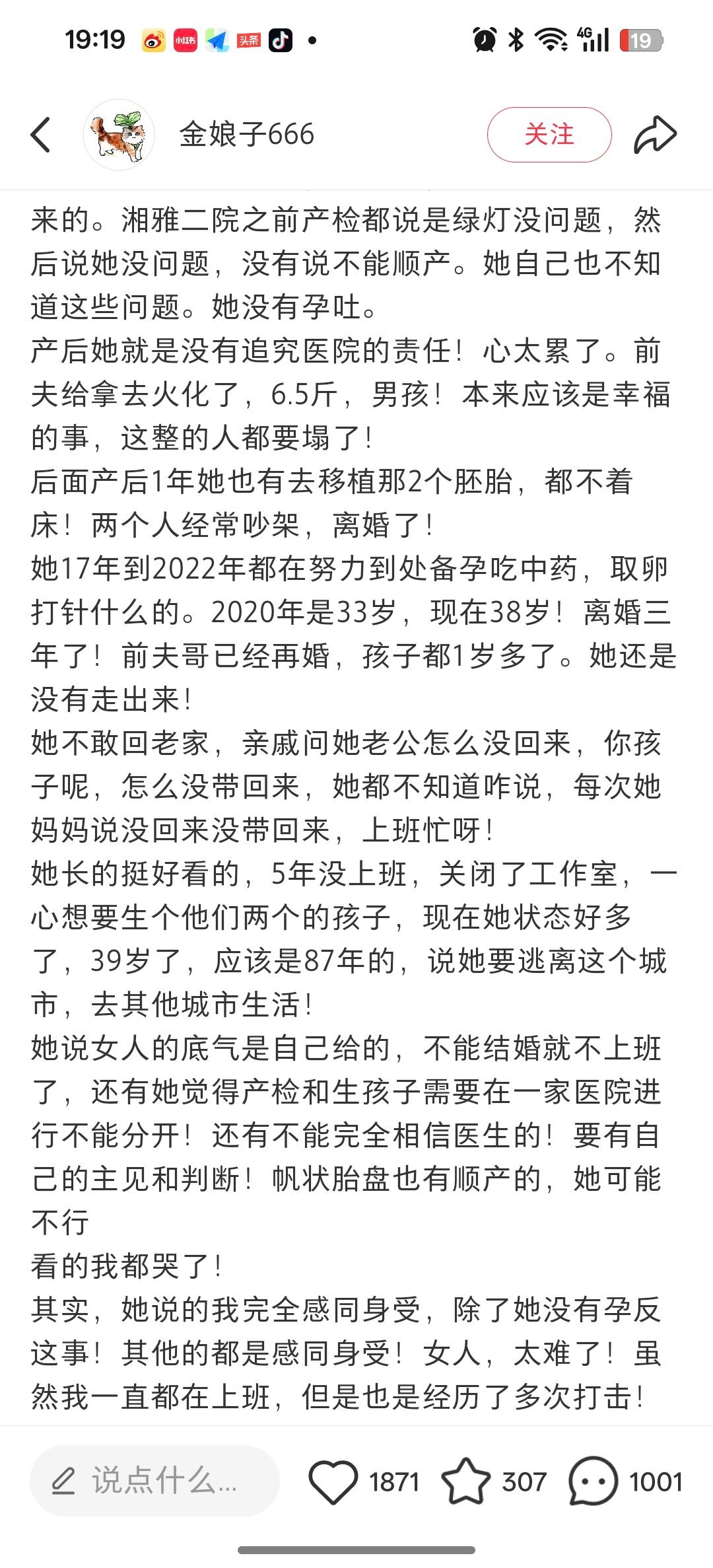 朋友给我发了个帖子说怎么会有这么苦的女人?看了下,和丈夫多年怀不上孕,各种各样的东西都做过,吃中药也不怀,然后就决定试管。至少三次取卵。四次移植,其实看到这里我已经大概猜到了,结局不会太好……因为到了这样的份上,说明这件事情已经是严重红灯。花了五年的时间终于怀孕。最后因为口罩期间换了个医院生的问题,后面一个医院不知道他是帆状胎盘,让他顺产,结果40周大出血没生下来。搜索了一下帆状胎盘,指脐带异常附着在胎膜上,外形似船帆胎儿有生长受限、宫内缺氧、窒息的风险。出了这样的事情,自然感情也好不了。朋友说她好倒霉呀!经历了那么多的苦难,最后终于成了,还搞了一个这个下场。这位女士她怀不上,说明什么?说明他们俩没有缘分。如果任何一个女性遇到这种事情,她跟丈夫怎么都怀不了孕的话,说明他俩精卵不合适,双方细胞不契合,早就应该离婚换一个人。很多这种情况基本上换一个就好了。一开始如果直接换一个人的时候,应该还年轻。不换人强行非要怀。非要跟没有缘分的人把爱情进行到底。一定要跟她丈夫生一个。最后自己吃了所有的苦,尝遍了所有的痛。我自己,会非常在意一件事情做的顺不顺,特别是一开始。如果一件事情,比如一开始非常不顺。例如,如果刚滑不到一年,大腿摔断了。又或者没多久,右手摔断了,其实要是我的话,我遇到这种事情我就再也不滑了,因为我认为是上天告诉我不要去干,干了没好处。朋友听了说,感觉我说的好像有点道理,有的时候似乎是命运好像给了很多暗示,但是呢人没有看明白。作为主人公,要有去解读命运的暗示的想法或者思维,不然的话,命运已经给你很多暗示,其实你都会扭头走开,完全忽略。如果网友当中有碰到这种情况的,强烈建议你们换一个人。自己被动吃苦,不如自己主动换人。没有缘分还要进行到底,那么就是拼命的折腾,最后还是没有缘分。