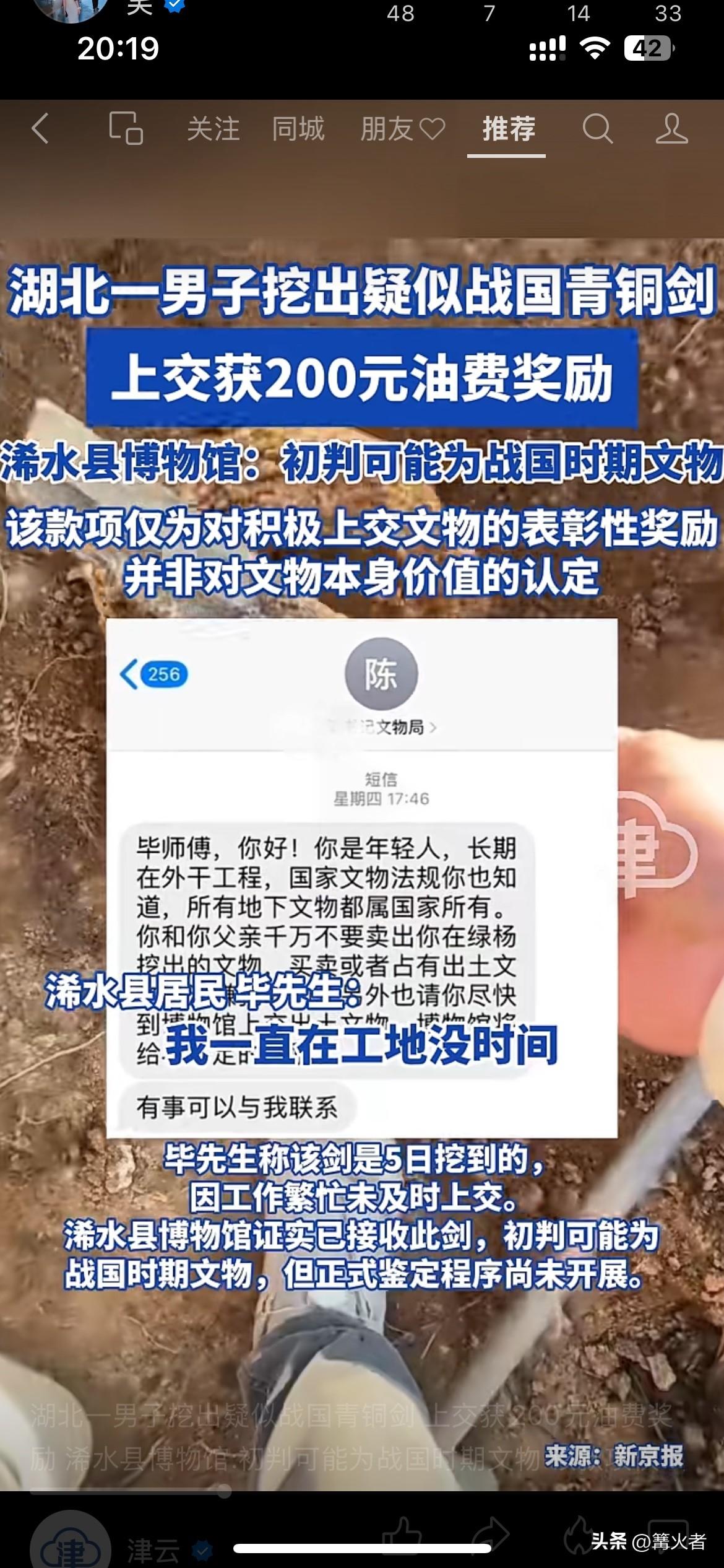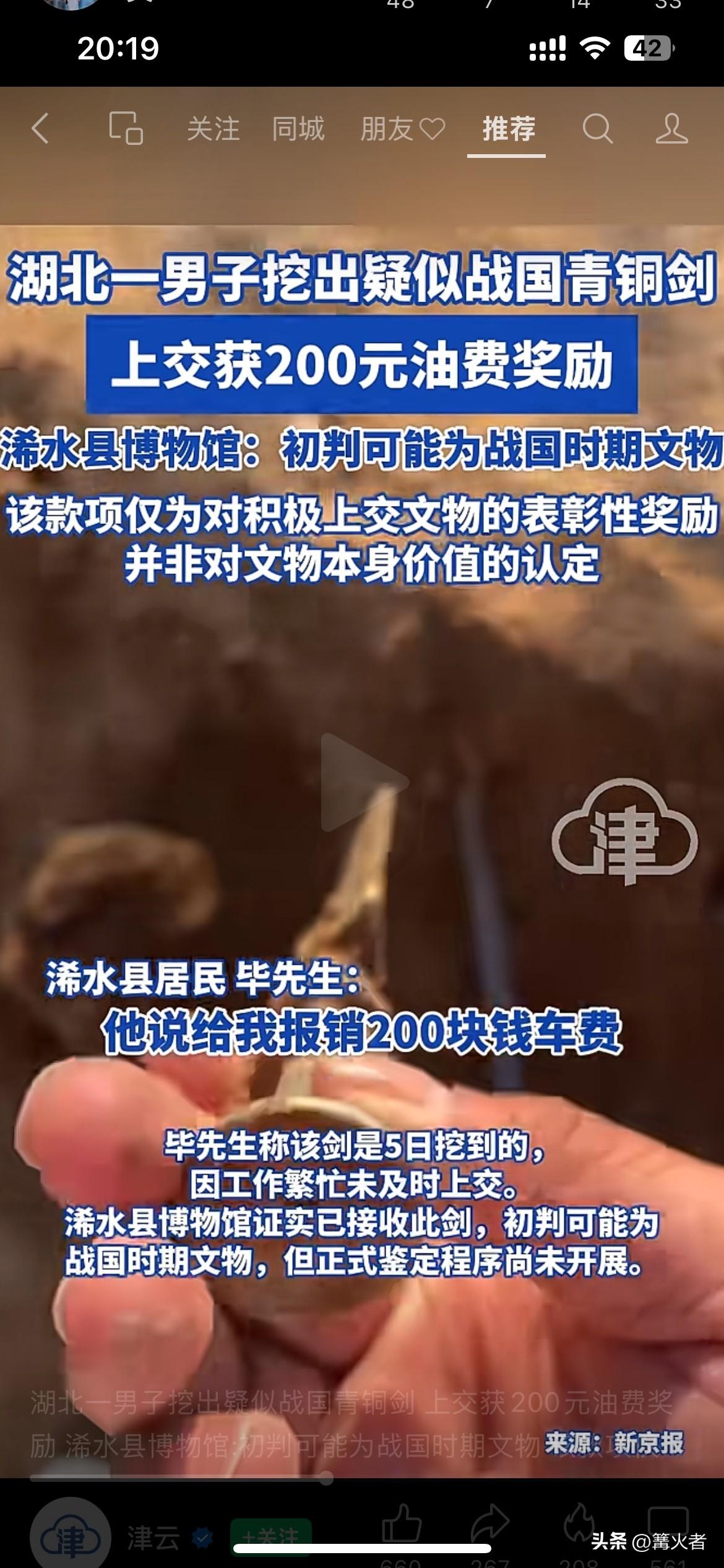 湖北这大哥挖出疑似战国青铜剑,浠水博物馆初判可能是战国文物。给200元油费奖励,这差距和文物价值也太大了吧。想想战国青铜剑,那可是历史的见证,价值连城,说不定还能揭开一段尘封的历史呢。但博物馆说了,这200只是表彰奖励,不是文物价值。