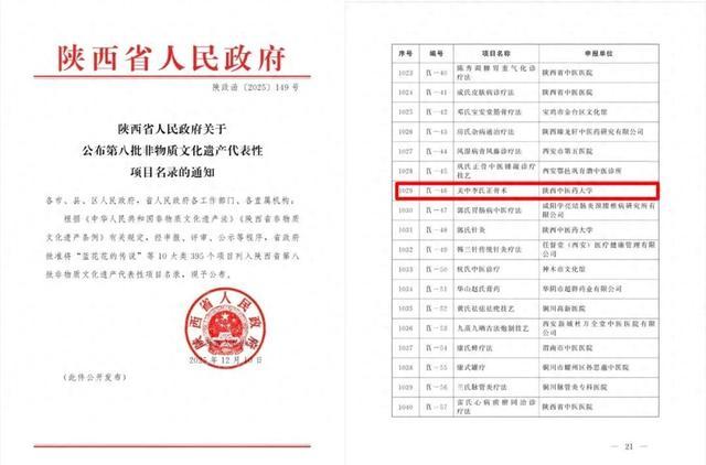 阳光讯(记者赵小康通讯员袁普卫余红超)近日,陕西省人民政府正式公布第八批非物质文化遗产代表性项目名录,由陕西中医药大学申报、陕西中医药大学附属医院为核心传承与实施单位的“关中李氏正骨术”成功入选。这一荣誉不仅是对医院长期致力于中医药传承创新工作的高度肯定,也标志着这项积淀百年的传统正骨技艺正式迈入系统性保护、活态化传承、创新性发展的新阶段。