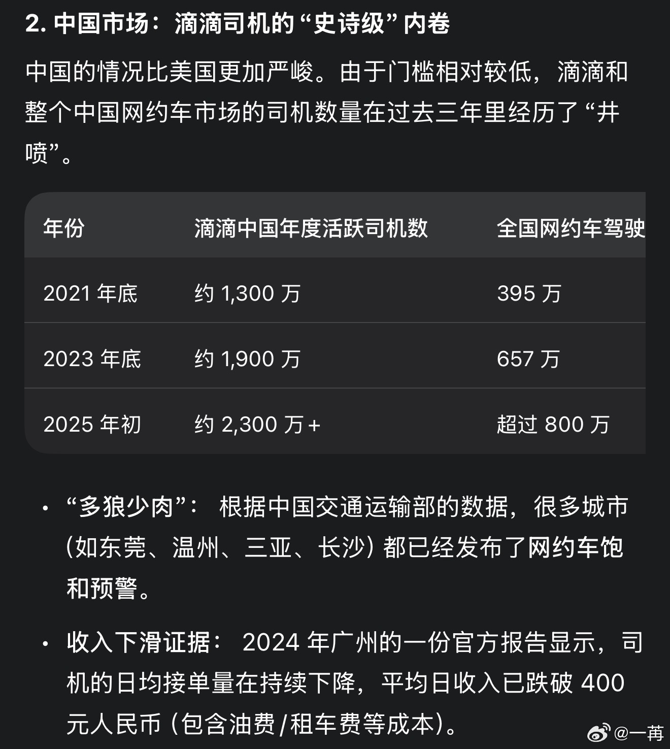 美国和中国网约车平台,都开始进入“狼多肉少”时代。隔着太平洋,但趋势是类似的,在超级平台面前,普通打工人的博弈能力非常有限。新技术加速运用,AI 无比火热,很多人失去工作后开始涌入网约车平台,但这是另一场风暴的开始。为了更好的验证,这是中美两个经济体的特质还是更广泛的趋势,我也查了一下巴西的情况,结果如出一辙。巴西正在发生的是 Uber 和 99(背后是滴滴)两强争霸,也在两年左右的时间网约车运力翻倍。网约车uber滴滴