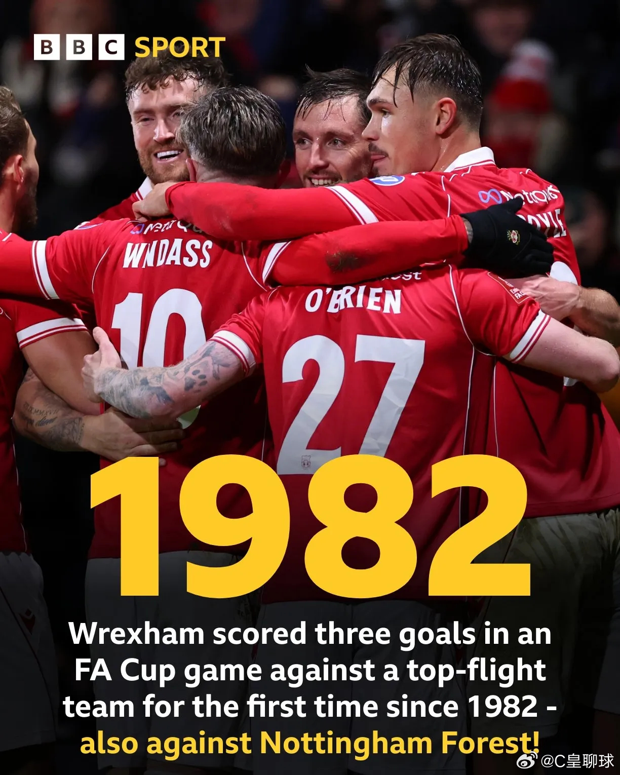 童话故事,英冠也有!英冠第九雷克瑟姆足总杯淘汰诺丁汉森林(常规时间3-3,经历加时和点球胜出),连年升级本场又斩英超队。雷克瑟姆本场比赛的11人首发身价之和刚刚超过3500万欧元,是对手诺丁汉森林(2.3亿)的1/6,以弱胜强。球迷热议:这才是足球该有的样子。