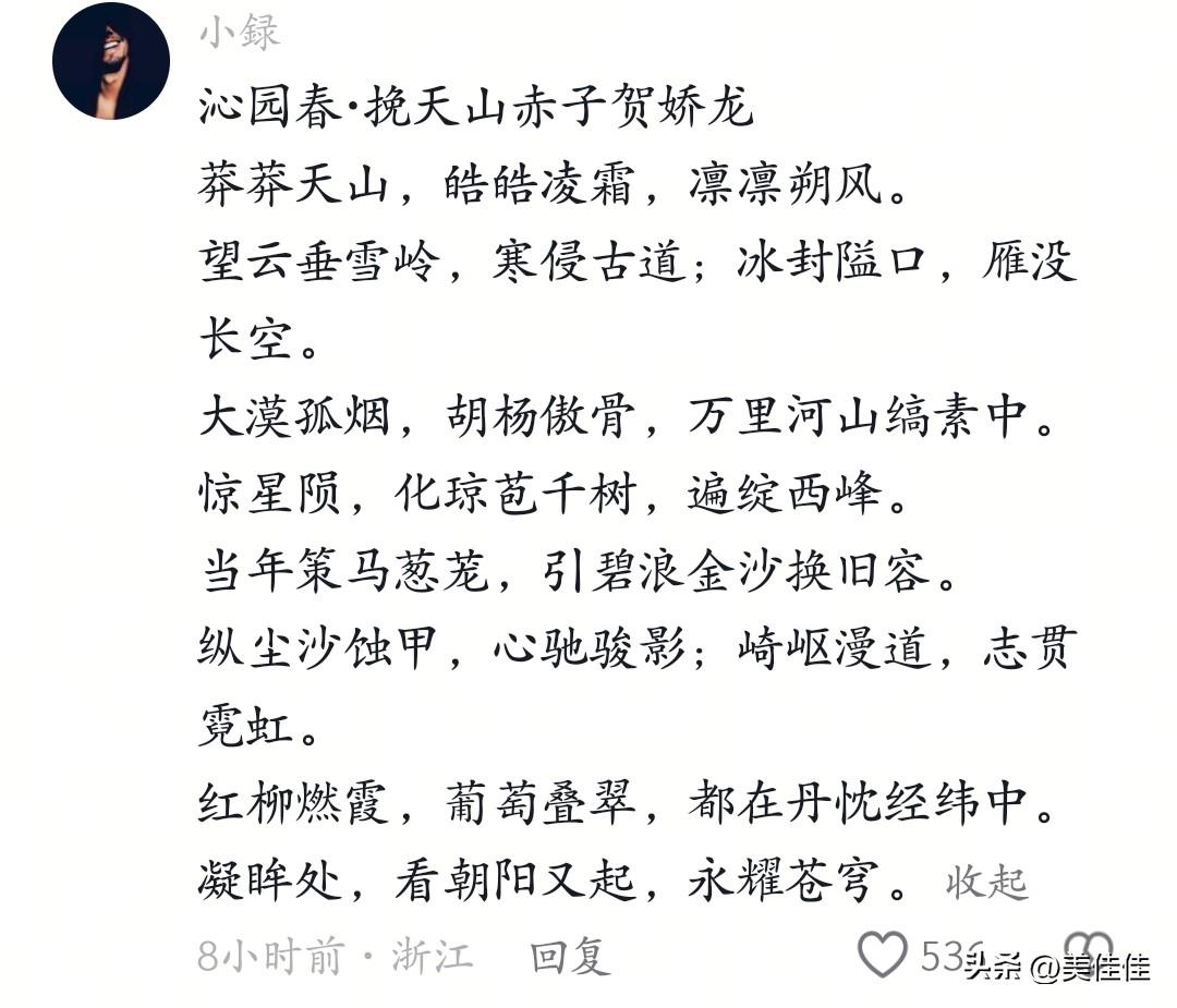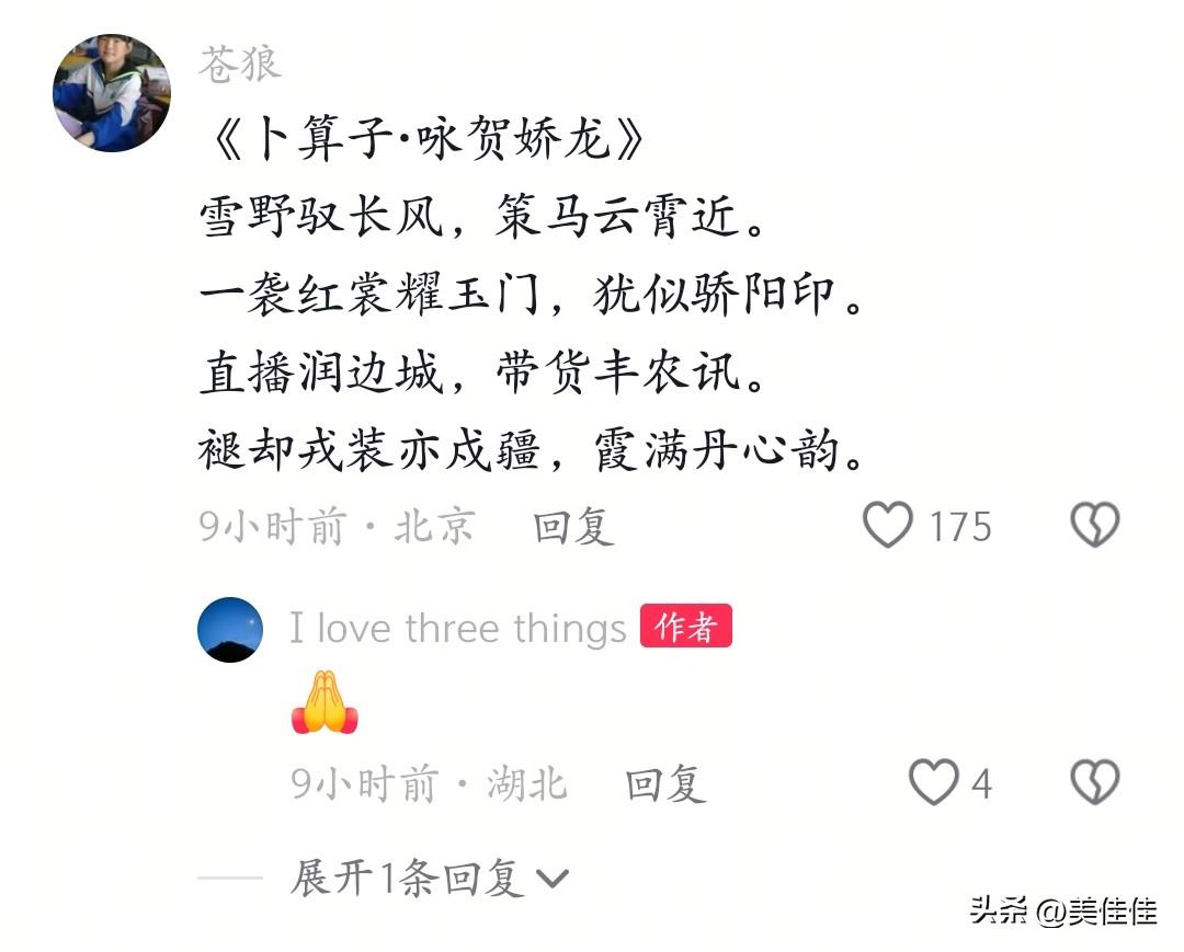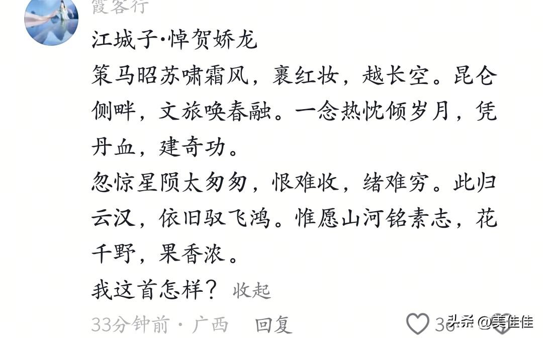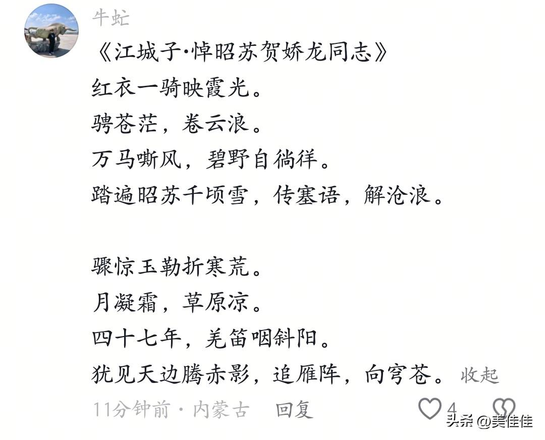 悼贺娇龙局长 天山雪野卷红裳,一骑追风拓路长。 直播声喧千万里,农产香飘九域疆。 半生奔走纾民困,数载躬耕富故乡。 纵使星沉身影杳,精神如炬照边疆。