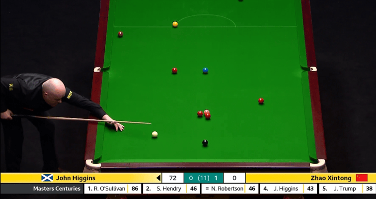 虎扑01月15日讯斯诺克大师赛1/4决赛,约翰-希金斯对阵中国球员赵心童。