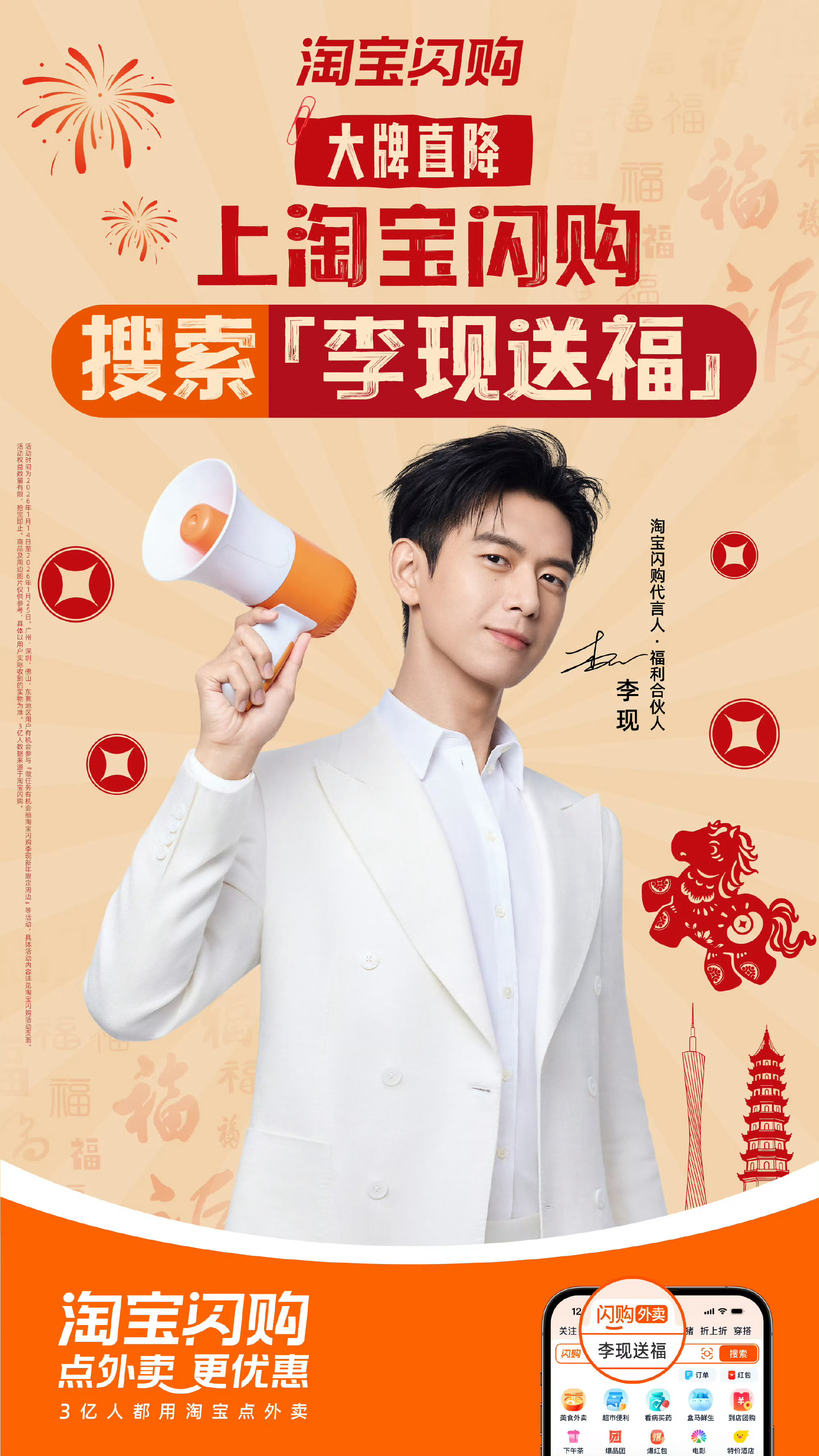 李现淘宝闪购代言人李现川渝新年福利 淘宝闪购代言人·福利合伙人李现又来送福利了!淘宝闪购搜索“李现送福”,开启与李现的新年闪购约定!快来参与,一起把喜欢的李现周边带回家!李现新年闪购计划 李现大湾区新年福利淘宝闪购大牌直降