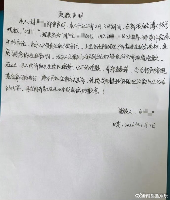 许凯黑粉登报致歉许凯黑粉手写致歉声明据企查查APP显示,1月14日,法院刊登刘某某致歉声明。刘某某表示,其在涉案账号上侮辱、诽谤许凯先生的言论,系不负责任的不实言论,已深刻认识到自己的错误行为,向许凯致以诚挚、公开的道歉。据悉,刘某某已在涉案账号上发布手写致歉声明。