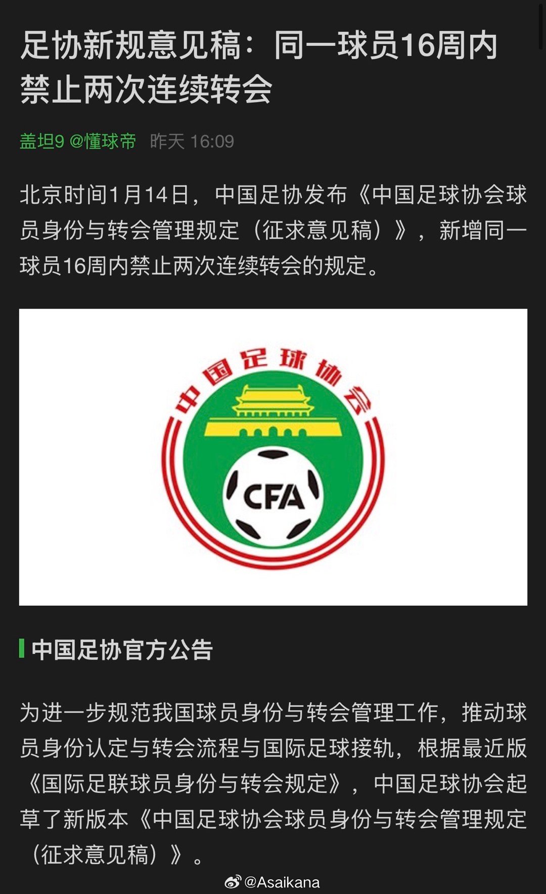 并不是新增规定,因为反过桥转会(16周也是相关内容)是国际足联规定里早就有的规则,中国足协也早就开始按国际足联要求执行了,只不过因为一直没有修订,没有加进国内自己的规定里(国内需要同时执行国内和国际的规定)。这次主要修订内容之一就是把国际足联各项规定也同步加进国内规定里。