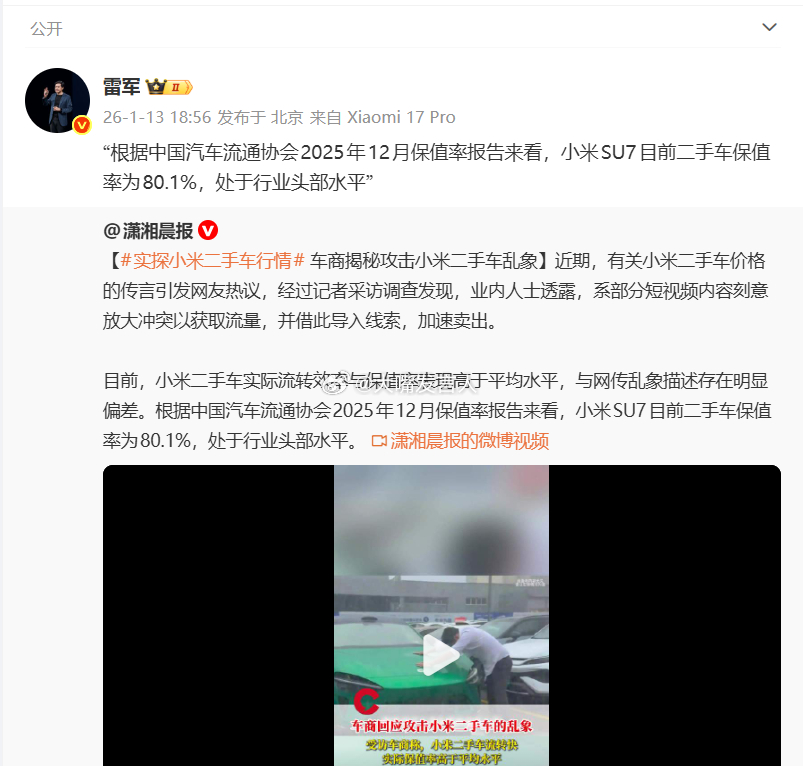 小米二手SU7 Ultra35万没人要 媒体不要乱讲,说什么车行老板说小米二手车市场一塌糊涂(图1),雷总刚刚转发了一条消息,“小米SU7目前二手车保值率为80.1%,处于行业头部水平”(图2)实探小米二手车行情 车商揭秘攻击小米二手车乱象热点观点