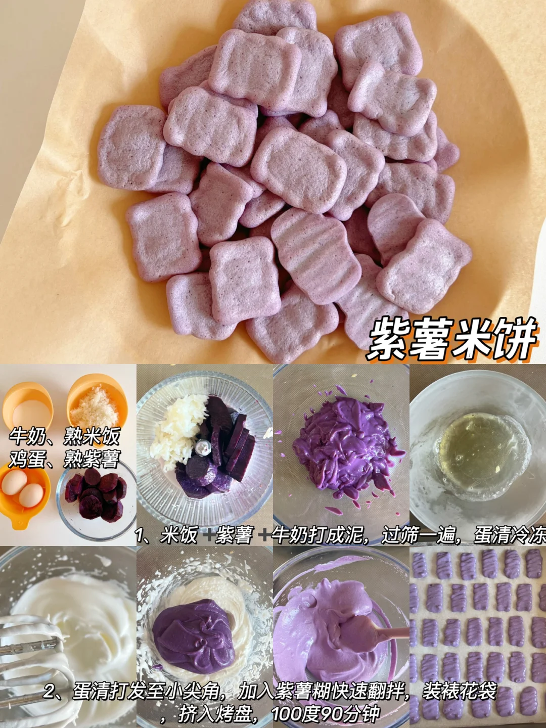 食材:熟米饭40g,牛奶60毫升、蛋清2个,紫薯80克