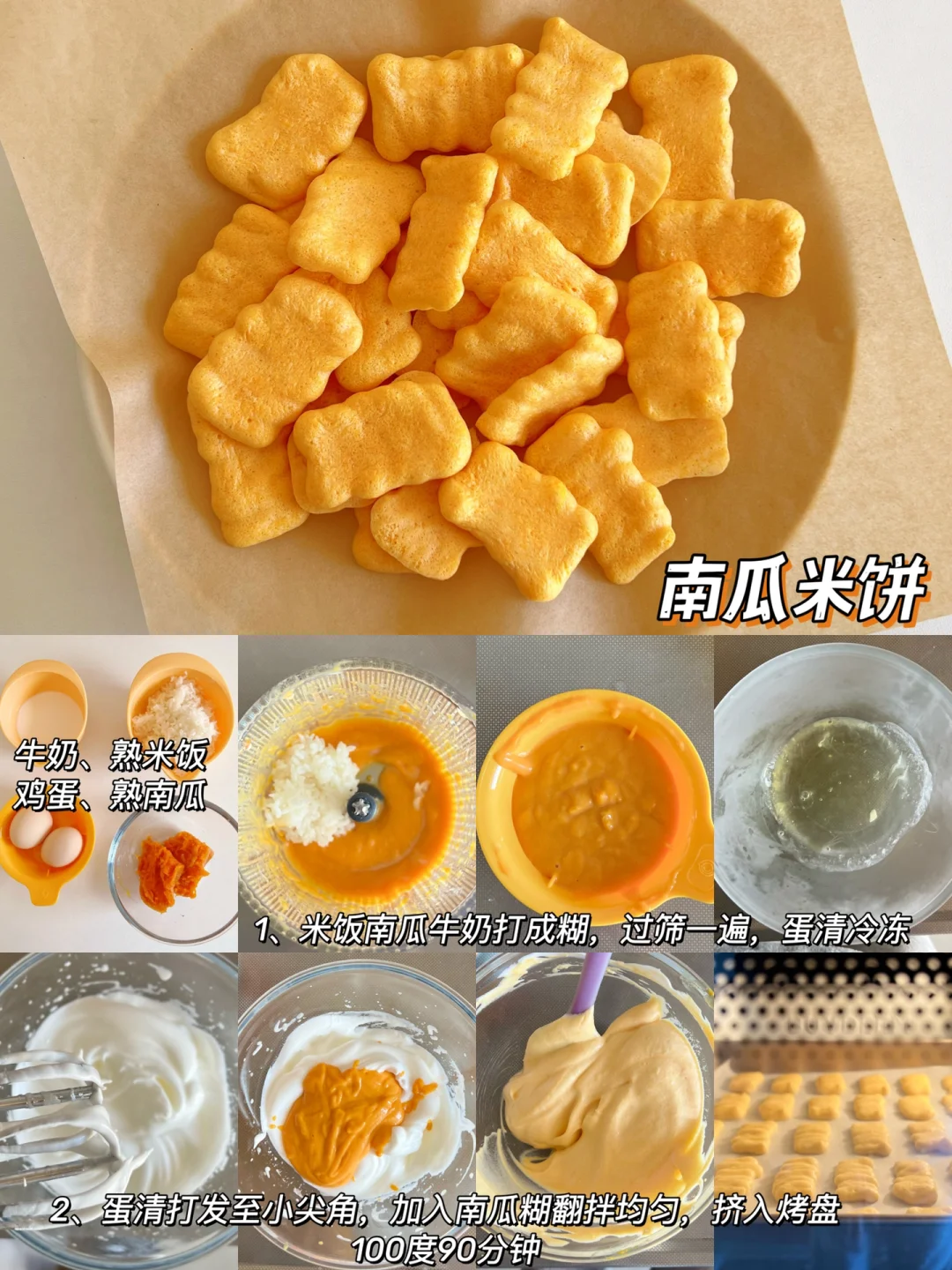 食材:熟米饭40克、牛奶40毫升、南瓜100克、蛋清2个