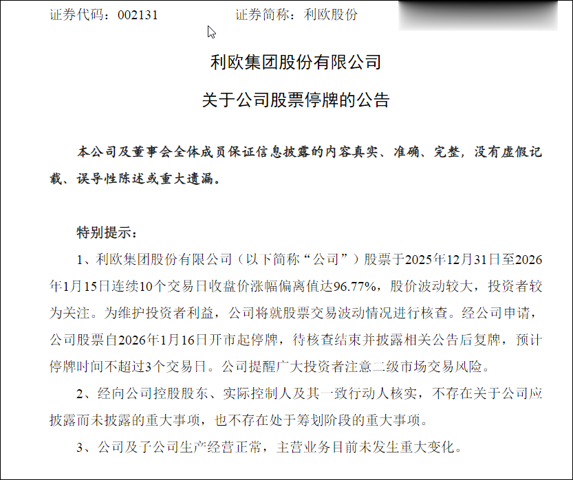 1月15日晚间,利欧股份(002131)披露公告称,公司股票于2025年12月31日至2026年1月15日连续10个交易日收盘价涨幅偏离值达96.77%,股价波动较大,公司将就股票交易波动情况进行核查。公司股票自1月16日起停牌,待核查结束并披露相关公告后复牌,预计停牌时间不超过3个交易日。