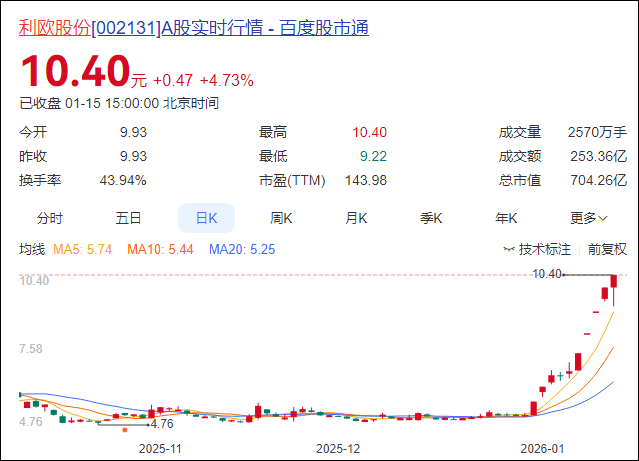 交易行情显示,2025年12月31日-2026年1月15日这10个交易日内,利欧股份股价区间累计涨幅达102.73%。1月15日,利欧股份收涨4.73%,收于10.4元/股,总市值704.3亿元。