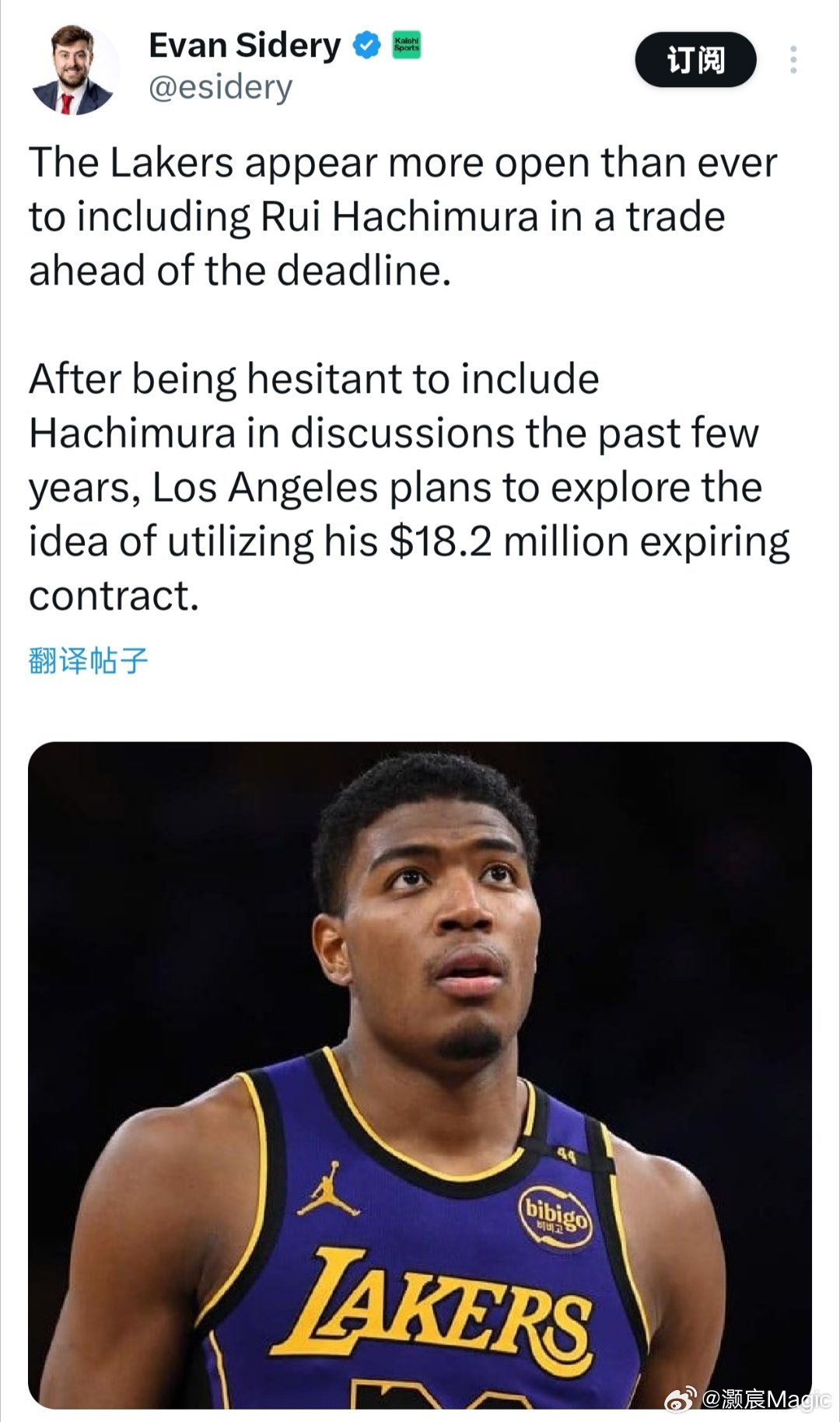 Evan Sidery:湖人似乎比以往任何时候都更愿意在交易截止日期前将八村垒加入交易名单。过去几年,湖人一直犹豫是否要将八村垒纳入谈判,但现在他们计划探索利用他即将到期的价值1820万美元的合同的想法。