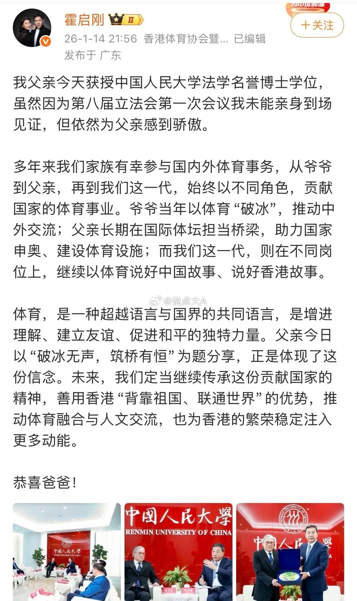 霍启刚发文,恭喜爸爸!今天晚上,霍启刚发文章,恭喜他的爸爸获授中国人民大学法学名誉博士!之后他又连续发了几张图片,是老爷子穿着博士服戴着博士帽,接受博士学位授予仪式 ,画面当中,霍老爷子看起来精神矍铄,气度不凡!接下来老爷子还专门上台进行了讲话,同时与人民大学相关的领导举行了会谈,霍启刚虽然没有在现场,但是他也通过发文章和图片的方式,来祝贺自己的爸爸。看来他这段时间比较忙,他发文章的IP地址显示在广东,就像他在文章中说的,无论是他爸爸当年从事体育方面的工作,还是现在他们在各自的领域里面努力的工作,都是站在不同的岗位,把自己的事情做好,用自己年复一年的行动,心好香港故事。
