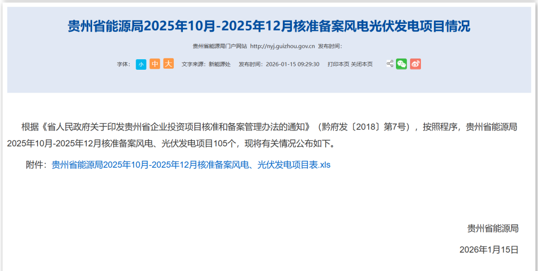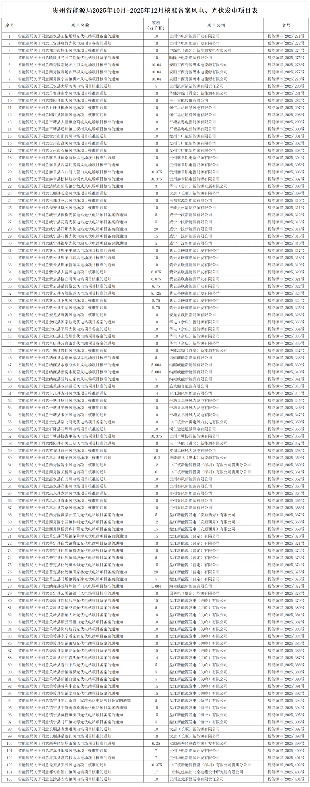 「风电之音」获悉,1月15日,贵州能源局发布2025年10月-2025年12月核准备案风电光伏发电项目情况。