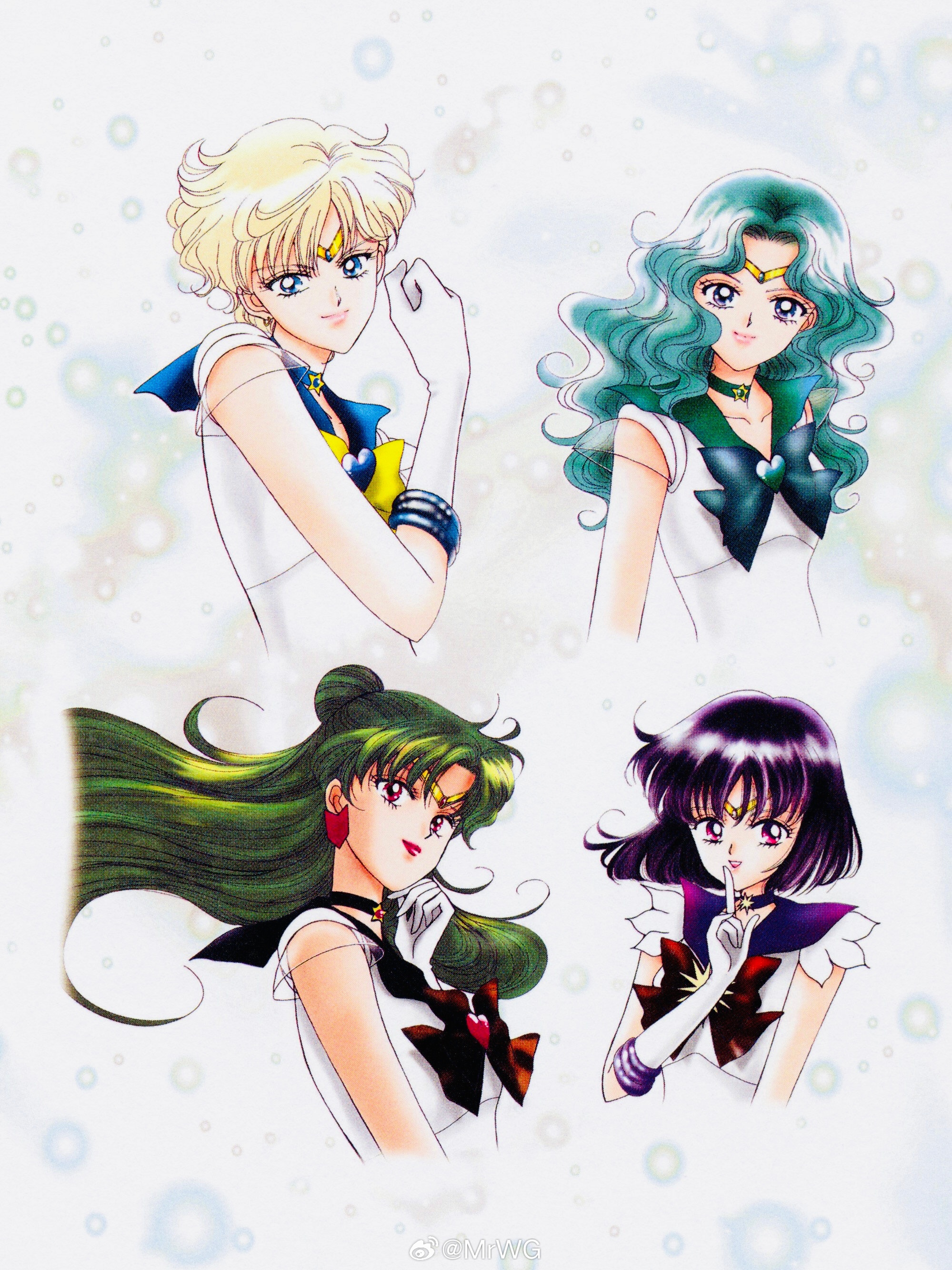 美少女战士海报 武内直子的原画YYDS,好美✨——内四合影:亚美/水手水星🩵+丽/水水火星❤️+真琴/水手木星💚+美奈子/水手金星💛;美少女战士 外四合影:遥/水手天王星🤎+满/水手海王星💙+雪奈/水手冥王星🩷+莹/水手土星💜。