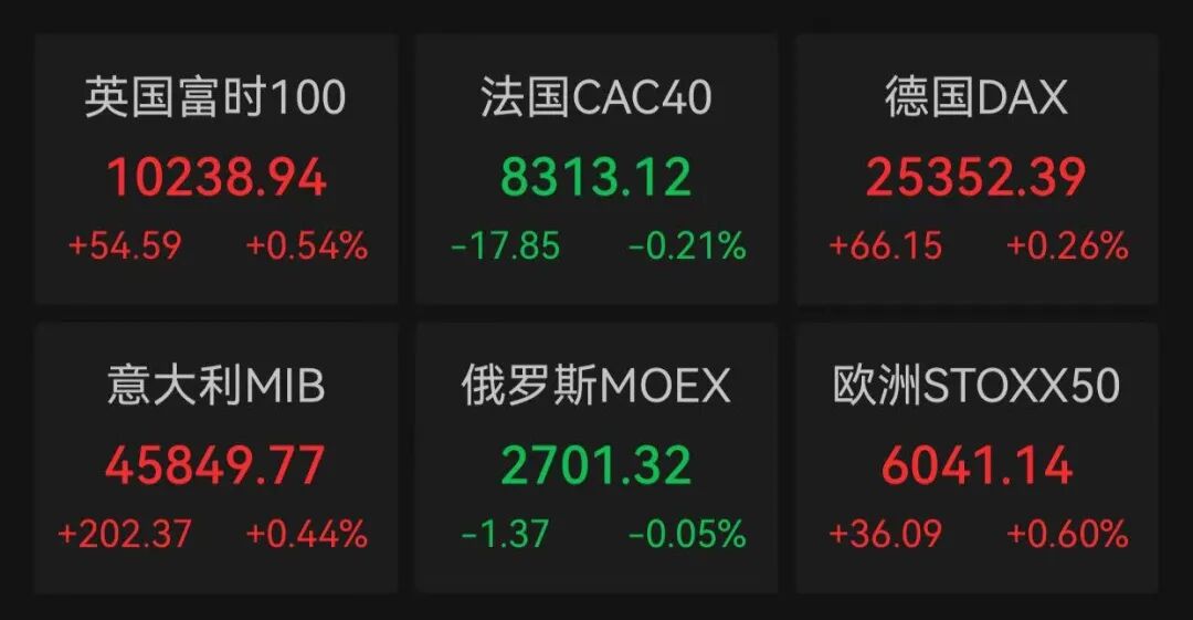 欧洲主要股指涨跌不一,截至收盘,英国富时100指数上涨0.54%,法国CAC40指数下跌0.21%,德国DAX指数上涨0.26%,意大利MIB指数上涨0.44%,欧洲STOXX50指数上涨0.60%。