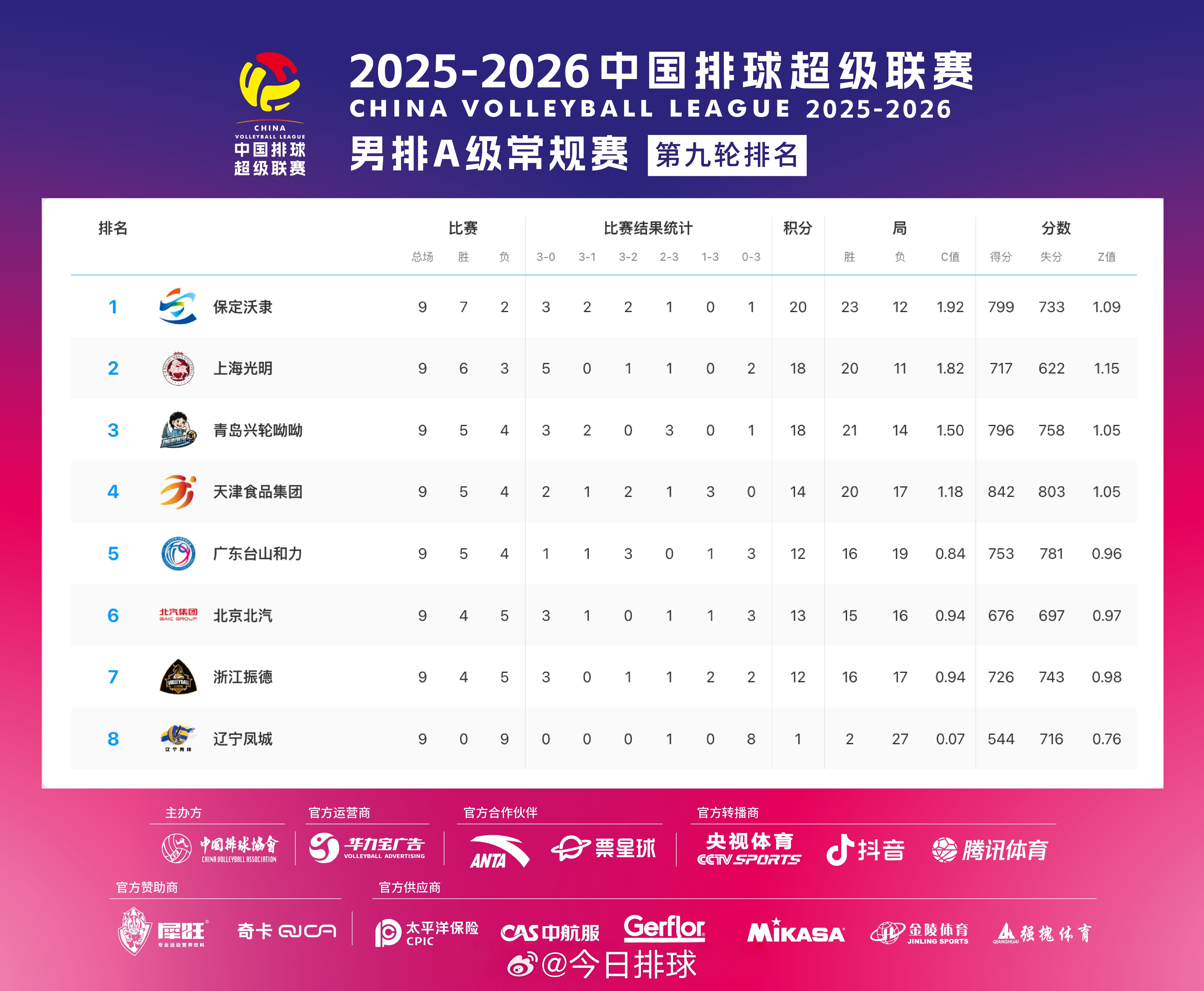 2025-2026中国男排超级联赛 A级和B级常规赛第9轮比赛结果,和此轮结束后