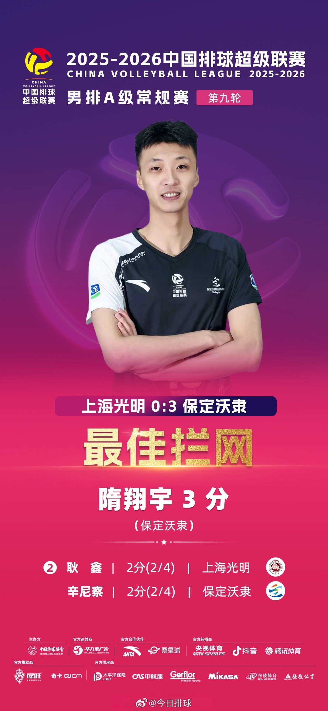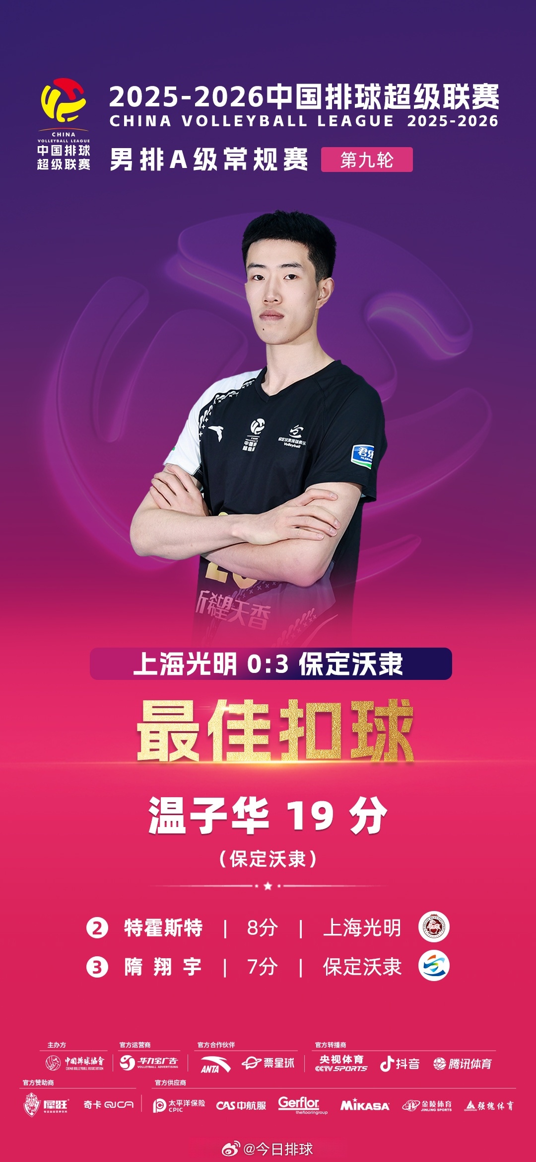 2025-2026中国男排超级联赛 A级常规赛第9轮焦点战 上海光明0-3保定沃隶 之本场最佳——最佳得分:温子华(保定沃隶)21分 最佳扣球:温子华(保定沃隶)19分 最佳拦网:隋翔宇(保定沃隶)3分跃见你我