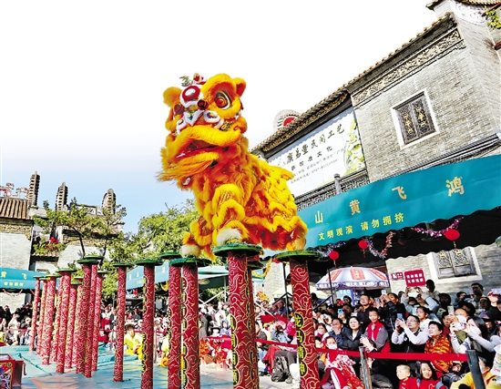 佛山黄飞鸿狮队在祖庙景区进行梅花桩表演。新华社发
