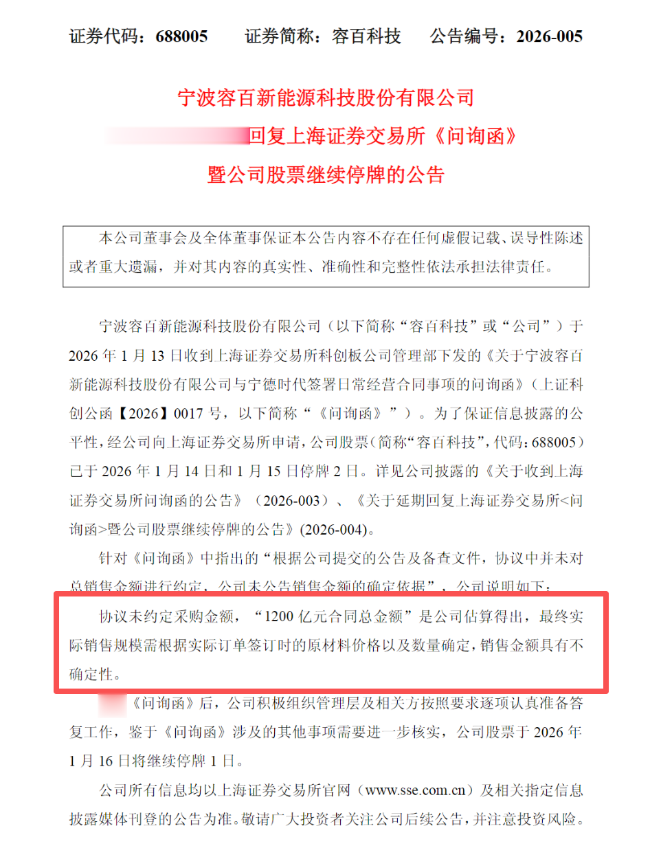 公告中,容百科技表示鉴于《问询函》涉及的其他事项需要进一步核实,公司股票于2026年1月16日将继续停牌1日。
