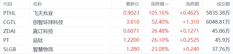 美股异动丨飞天兆业涨105.16%,为涨幅最大的中概股