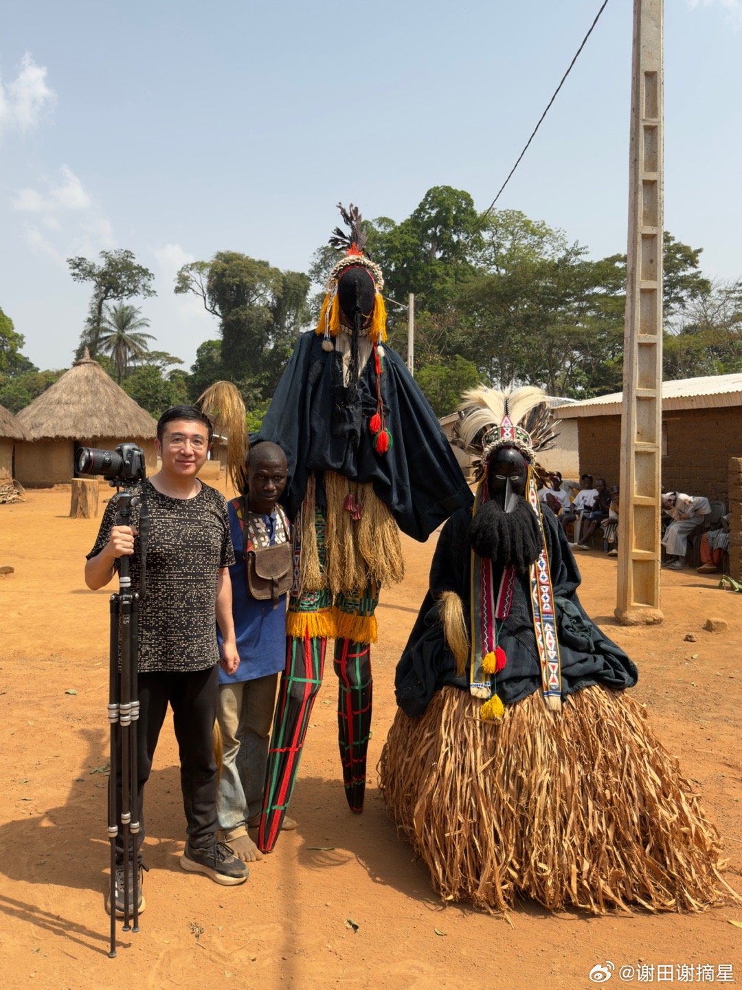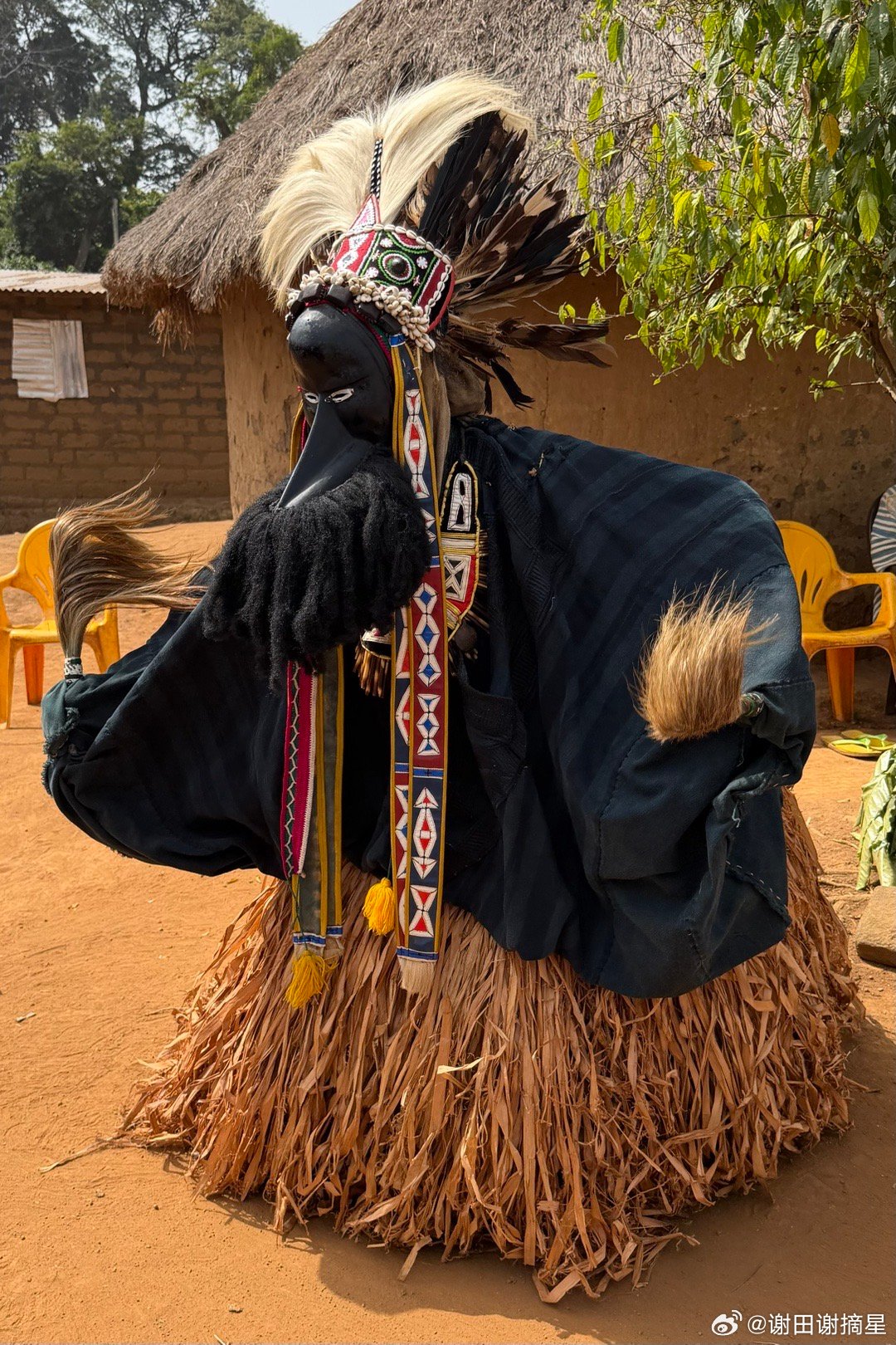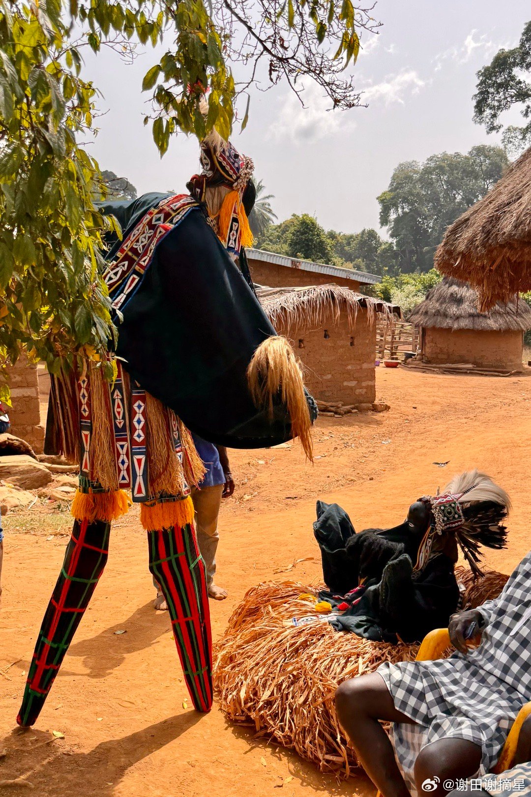 高跷舞和鸟人。科特迪瓦(象牙海岸)Dan族Yakuba人的传统仪式表演高跷舞,当地称为Kwuya Gblen-Gbe,通常在村落庆典、仪式或迎接访客时表演。整个表演从“神圣森林”的边缘开始,象征灵界与人间的连接。先有长时间的女性唱歌和男性舞蹈铺垫,第一个出现的是Ge Gon鸟人,它在Dan族信仰中象征智慧、预知、先知和连接天地(鸟能飞翔,传递祖先信息)。Dan族相信面具不是简单道具,而是活的灵,舞者通过梦境被灵选中,穿上面具后就成为那个灵,讲灵语(旁人需翻译)。鸟人在仪式时先从森林出现,驱散邪灵,再召唤高跷主灵。主灵踩着木制高跷出场,全身装饰,面蒙黑布。高跷象征“升天”和“连接人间与灵界”。能当主灵的人必须经过严格而秘密的仪式,他的亲朋好友,甚至妻子都不应该知道他是主灵的扮演者。主灵的标识动作是跳着转圈,这是很危险的动作,用于展示强大的灵敏和力量。它边舞边发出尖锐、怪异的叫声,这是在模拟祖灵说话,旁人难以听懂,只有解说者能翻译。合影时候在我和高跷主灵之间的,就是人间的解说者。谢田的环球足迹